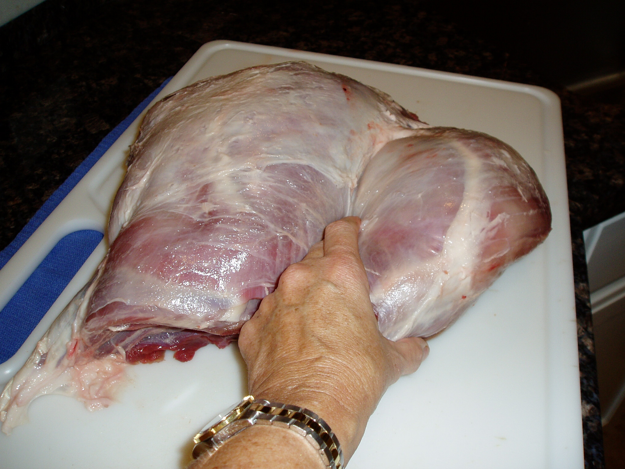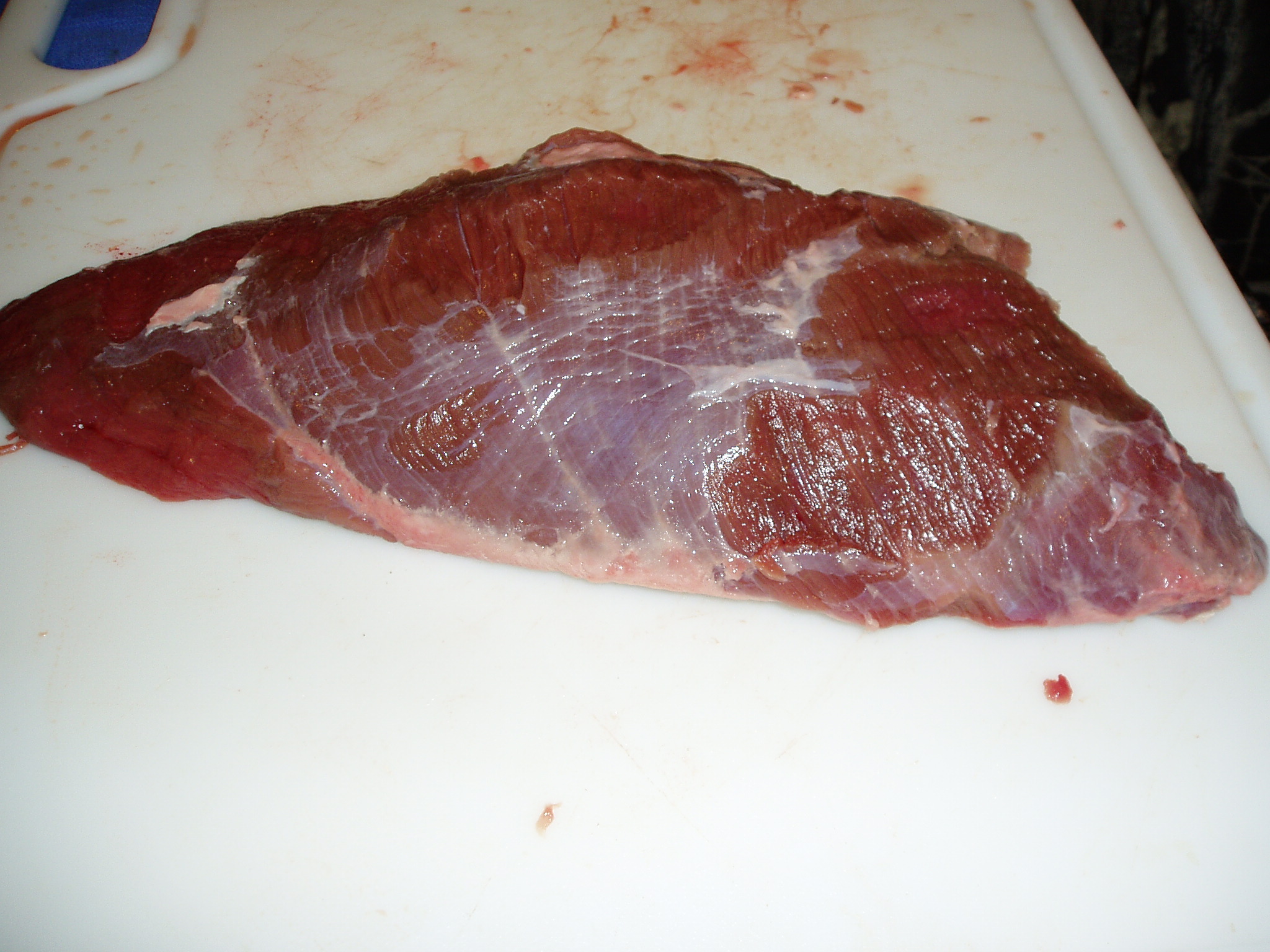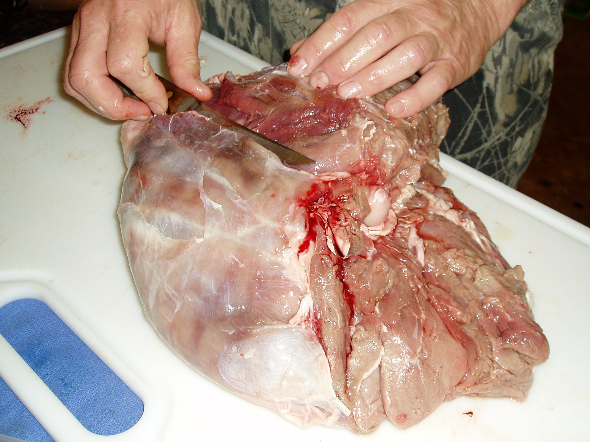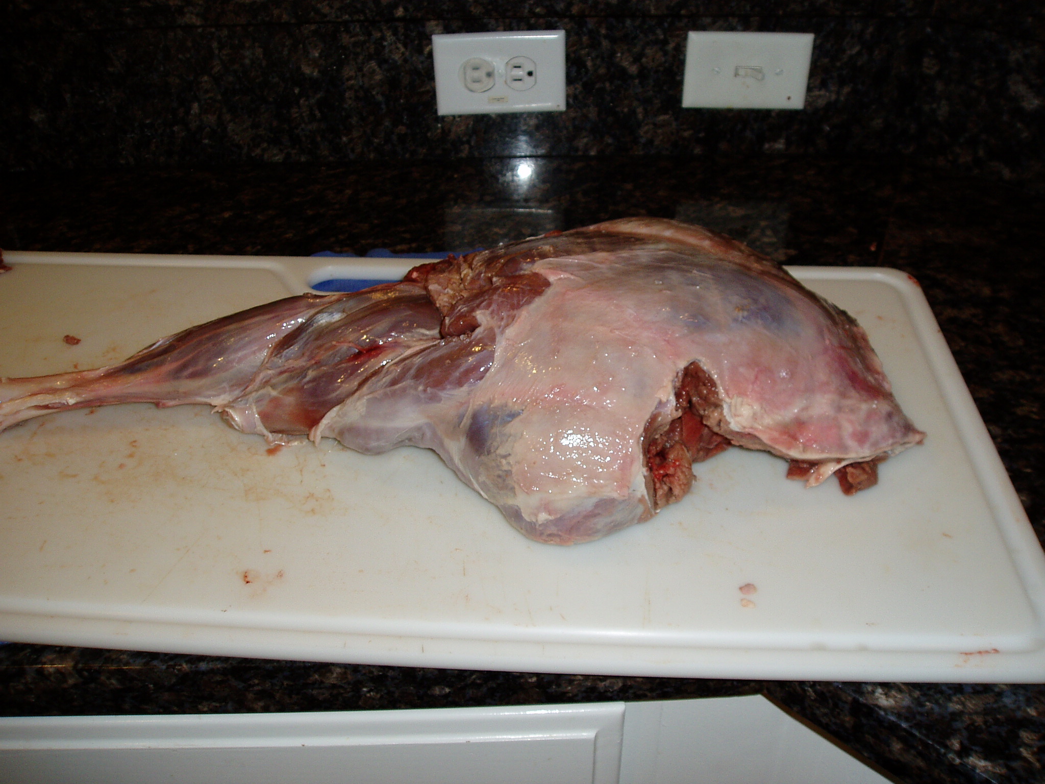 After the meat has been skinned out, place it on a large cutting board, hip-side down. This allows you to see the different muscle groups.