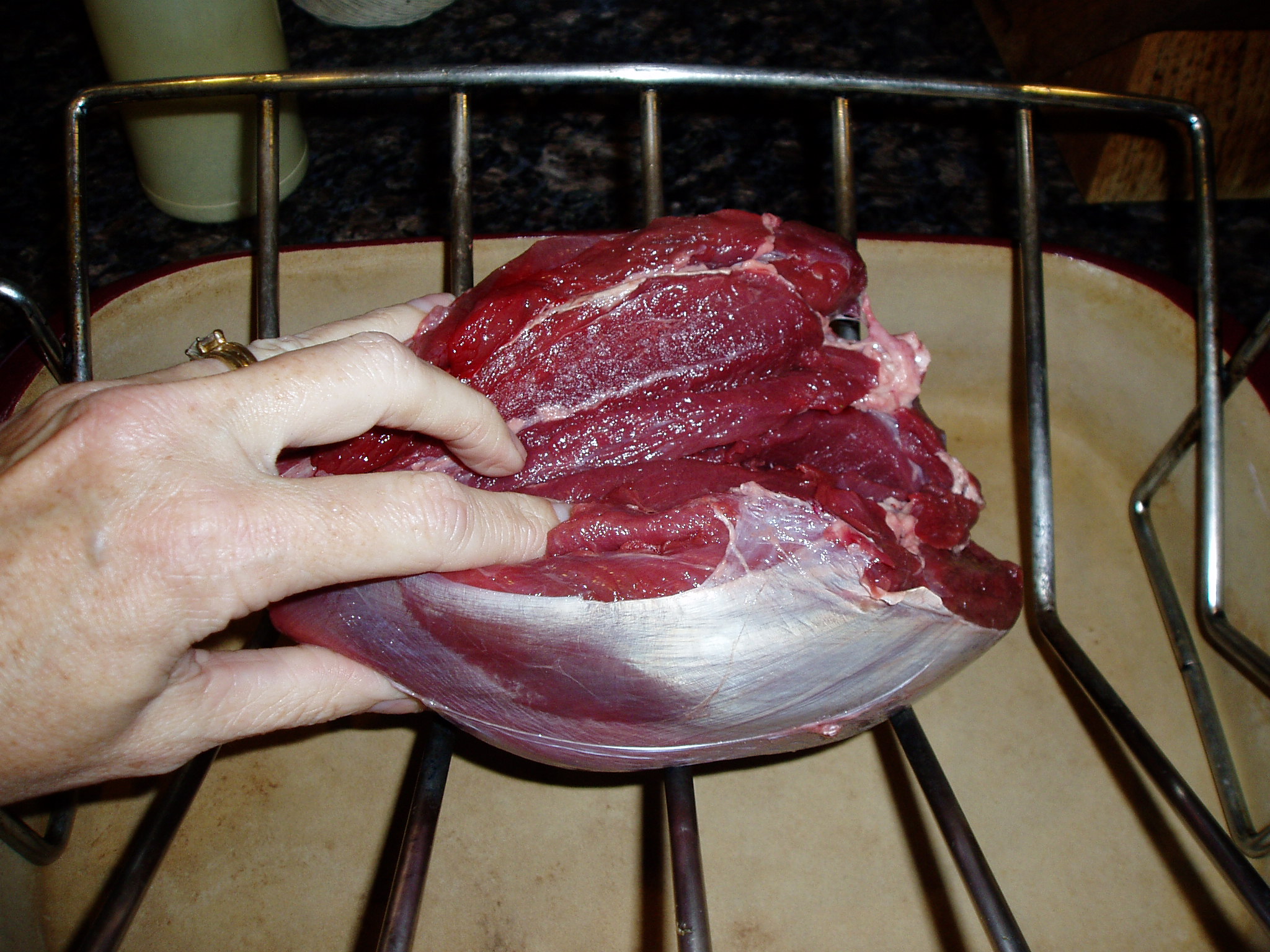 The muscle that I usually use for a roast I refer to as a “football roast”. It is shaped like a football, and approximately 10 inches long. Unlike the other muscles in the hind quarter, it is rounded on the ends.