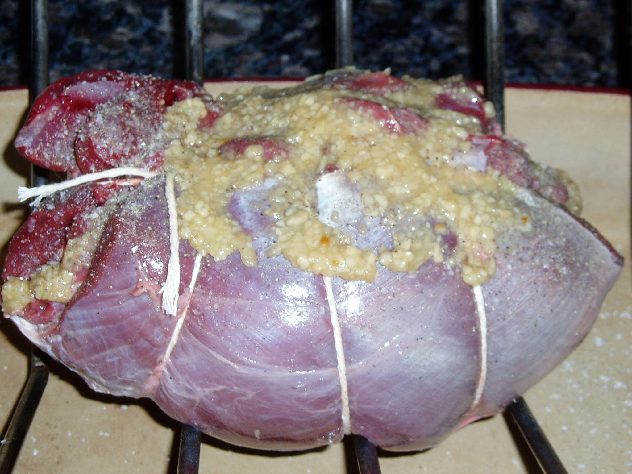 Liberally season cavity in the meat with Salt & Pepper mix and garlic. (I have to admit that I use prepared garlic in a jar for this particular recipe. I’ve prepared this recipe using fresh garlic and I’ve prepared it using the stuff in the jar. There is so much garlic needed in this recipe that fresh garlic is a little overwhelming. Don’t get me wrong! The intense eye-popping flavor is right up the alley of my junior deerslayers. However, I find that the more subtle flavor of the prepared, chopped garlic allows the other flavors to come through.)