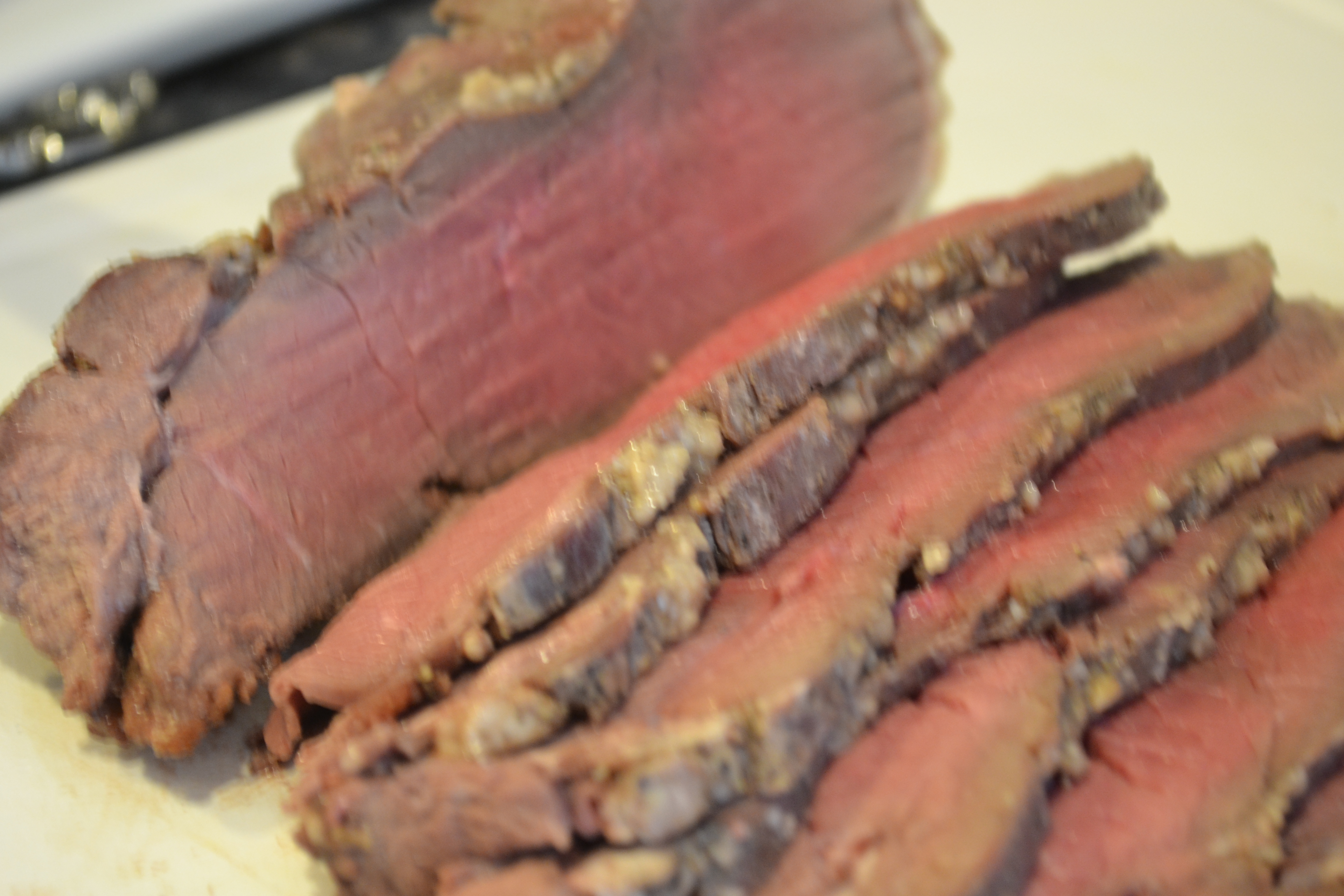 Place in 350 degree oven for 45 to 55 minutes for a rare to medium rare roast. I’ve got to say at this point that if you don’t like rare to medium-rare meat, then don’t prepare this recipe. It simply doesn’t work if overcooked. The meat is tough and dry. Just don’t.