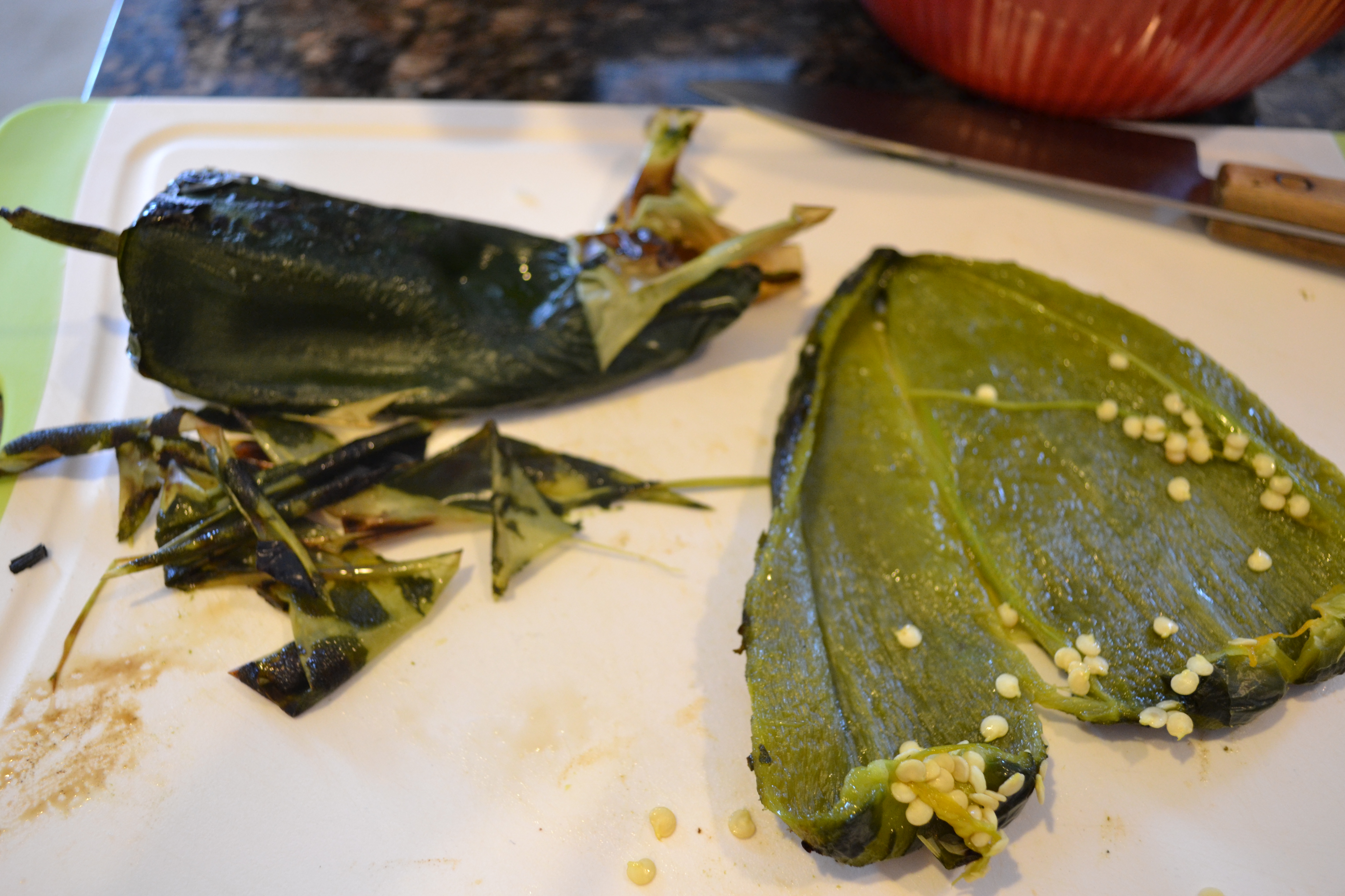 Remove poblanos to a bowl and cover with plastic wrap. Let rest for at least 20 minutes to allow skins to loosen.