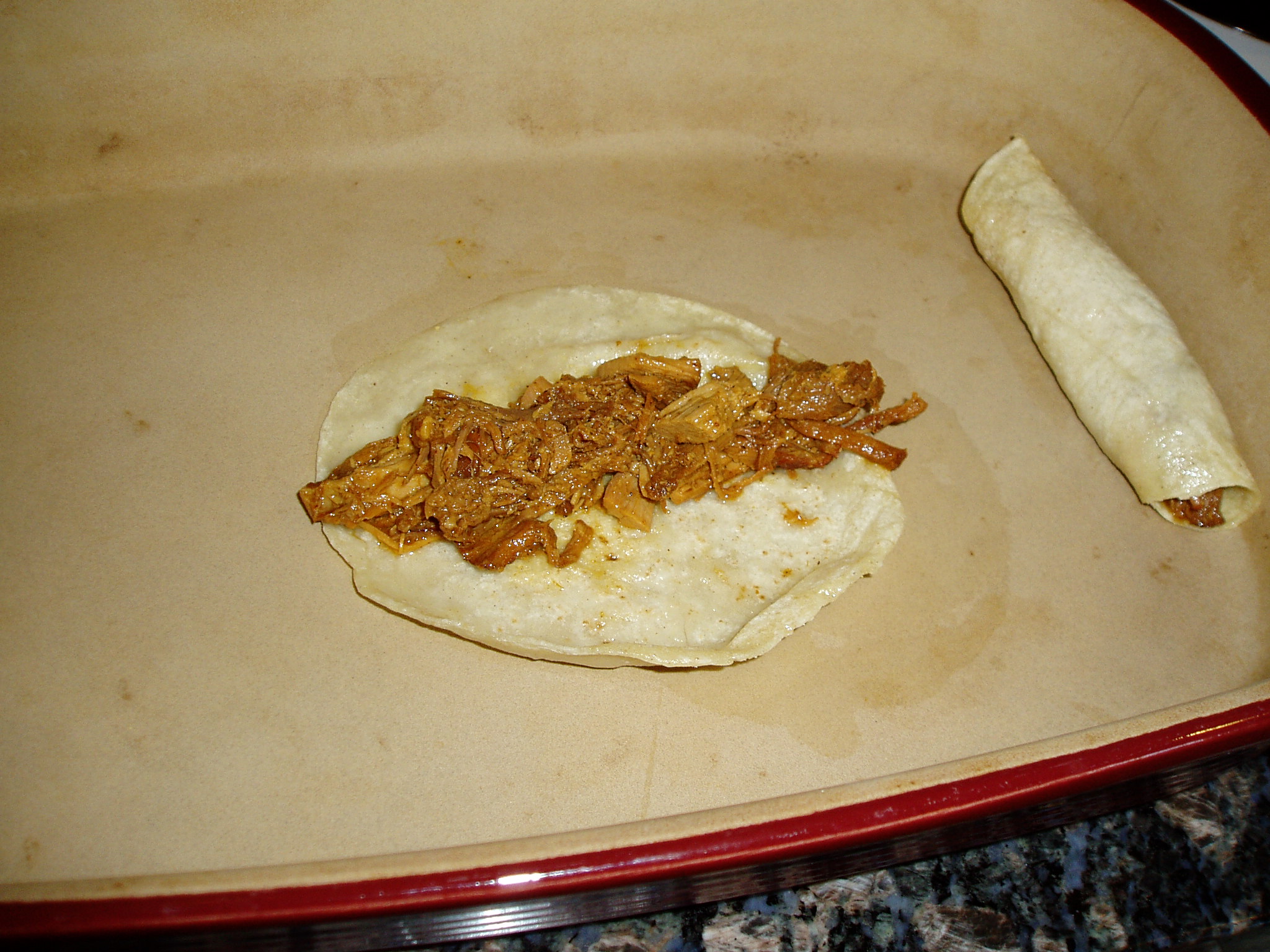 Continue this process until you have rolled as many enchiladas as you need. Set aside.