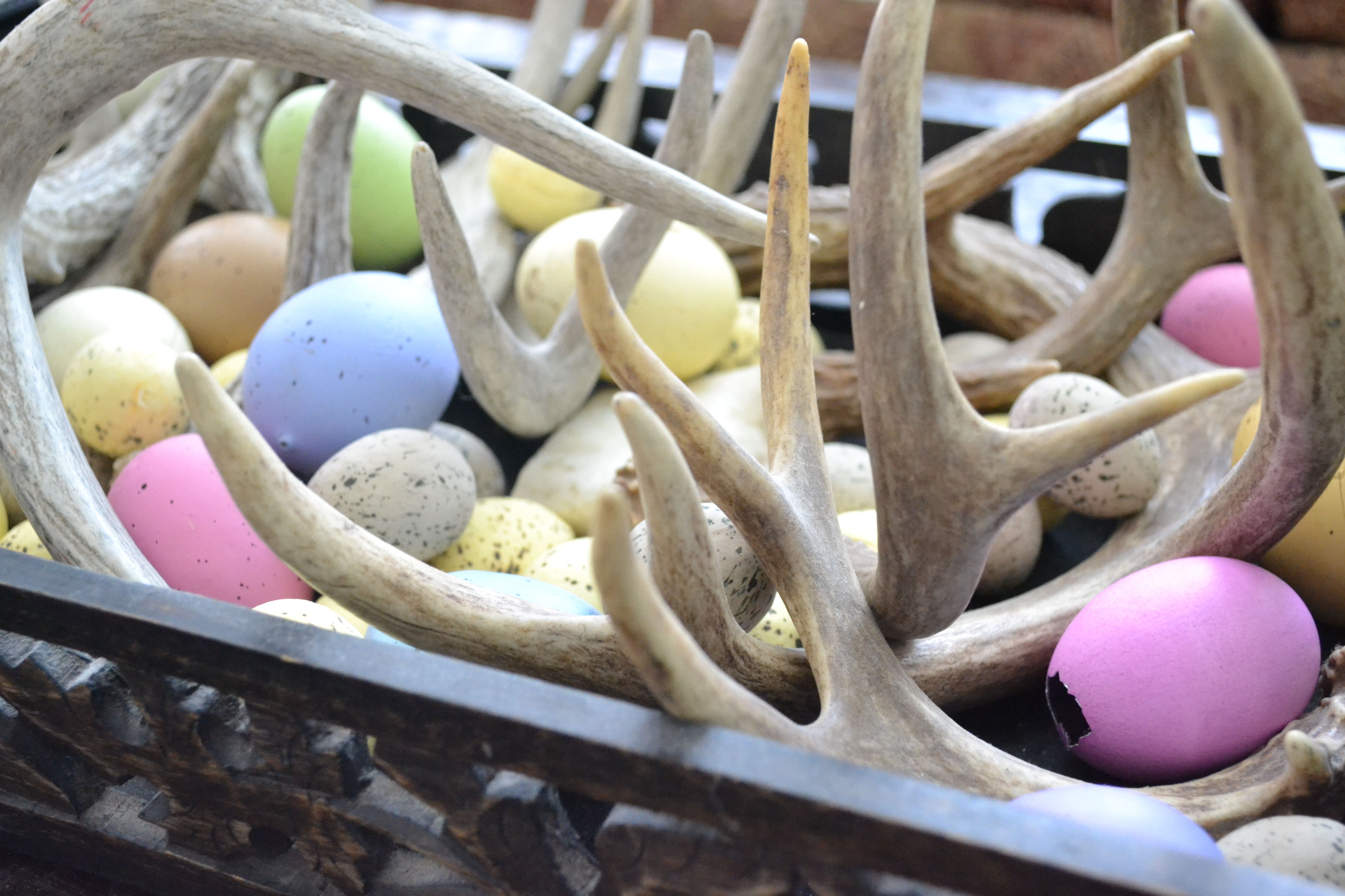 The eggs look like they’re skiing but my junior deerslayer devised this clever method for drying the eggs after they were dyed.