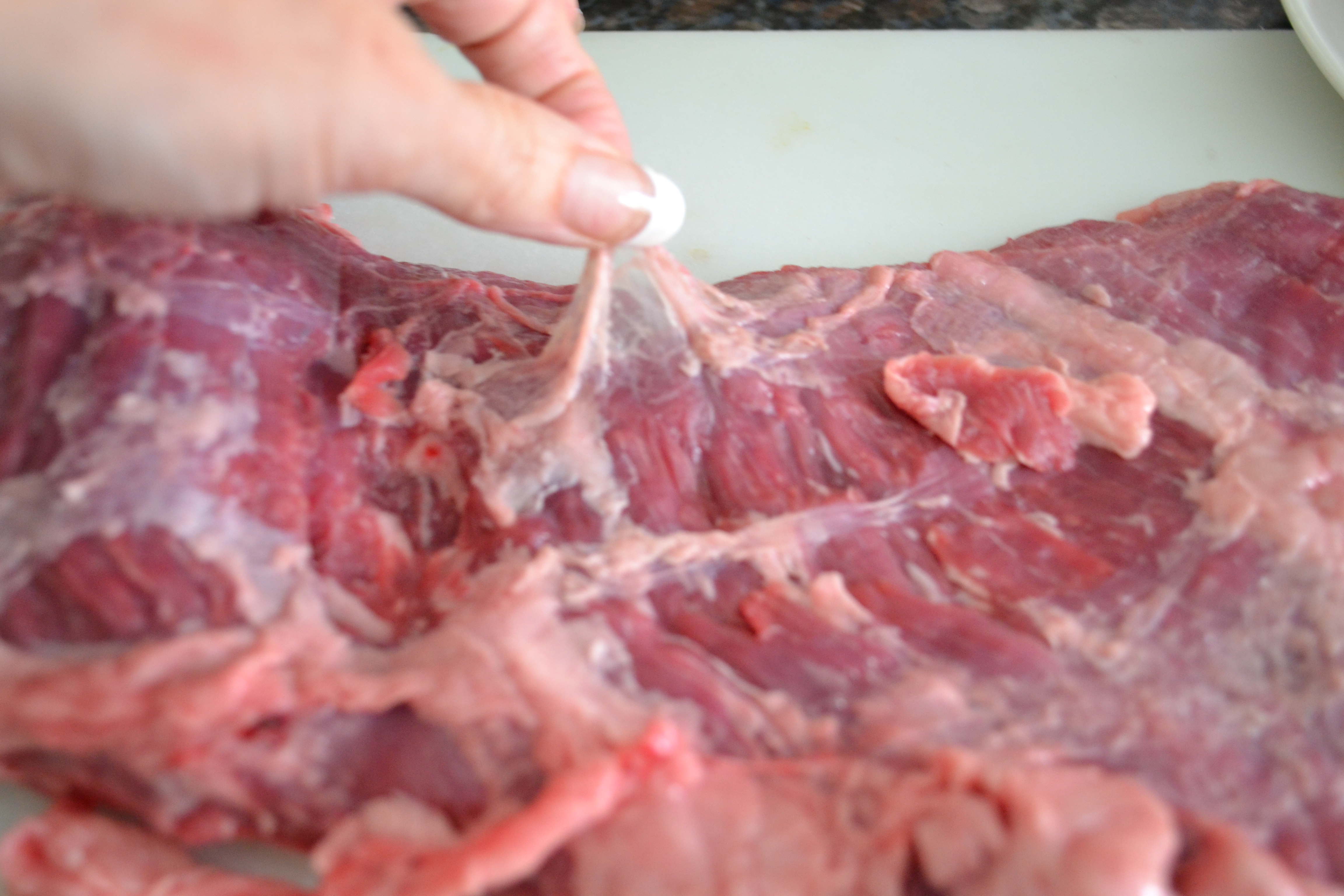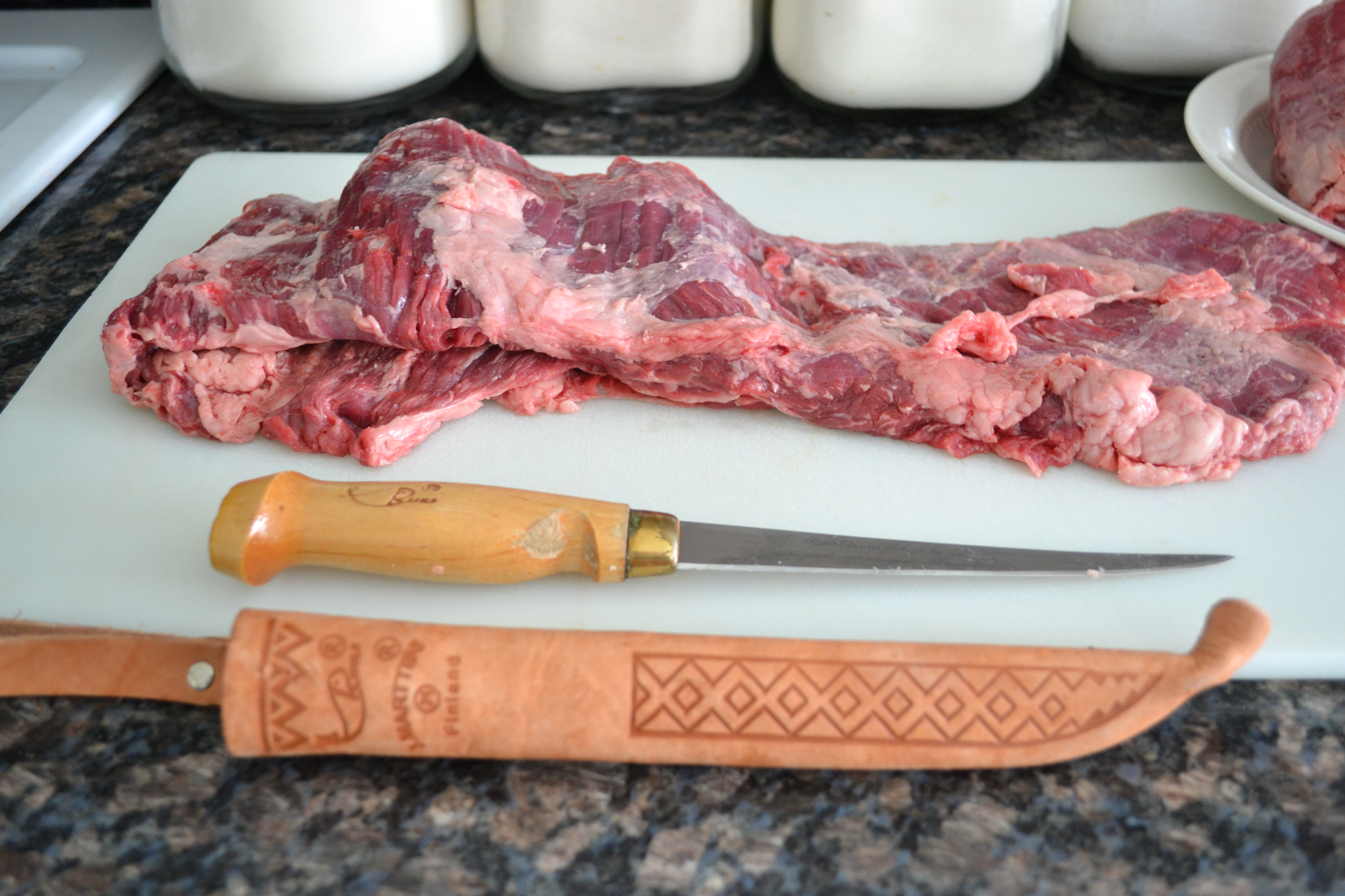 Fajitas, like I mentioned before, require skinning. This process is very similar to removing the silver skin or fascia from venison or elk. The skin can rather easily be lifted and removed using a sharp filleting knife. I have my favorite that I bought in the fishing area at Academy Sporting Goods.