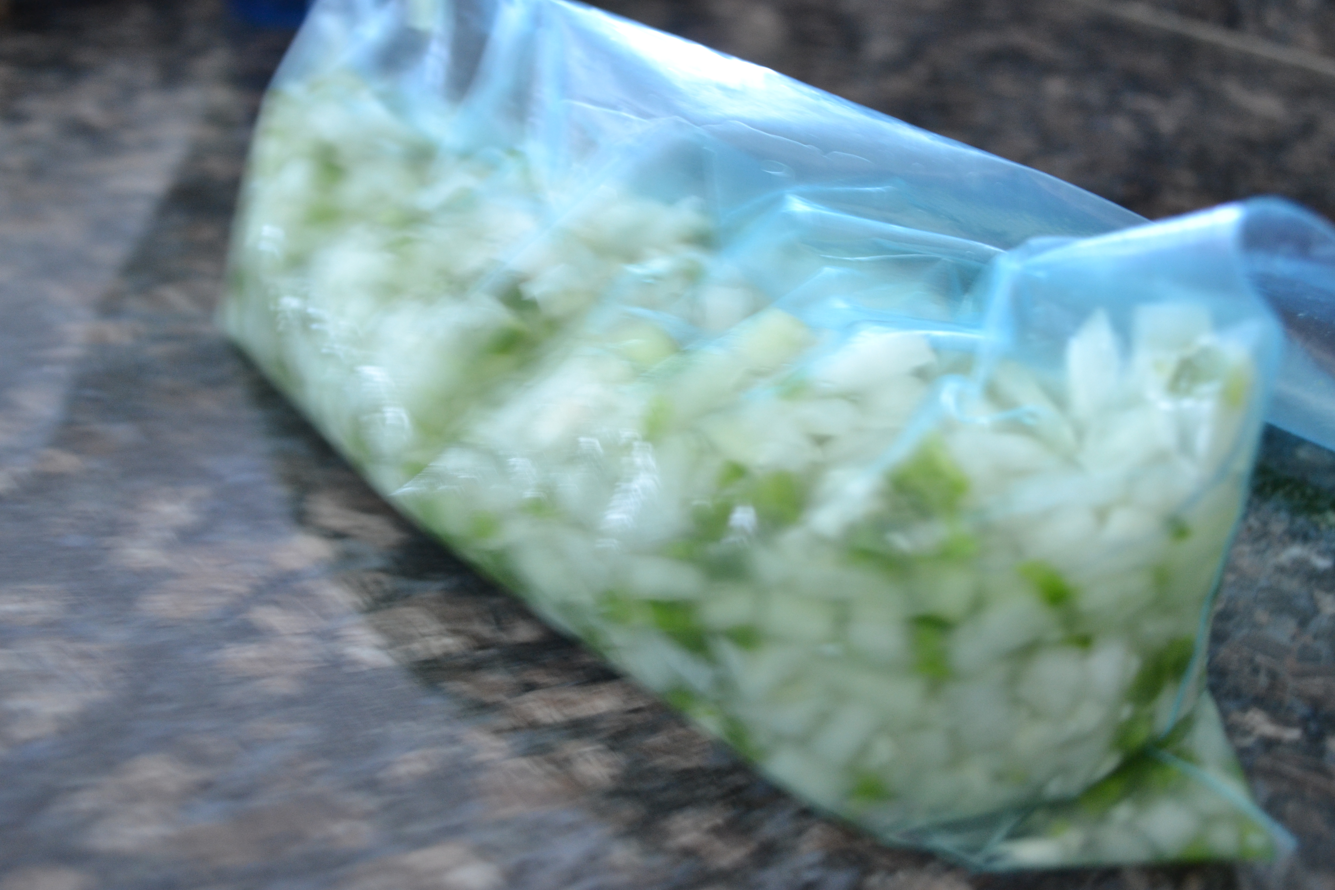 1. Add chopped onion, jalapenos, garlic in a one-gallon zip bag. Add enough apple-cider vinegar to cover. Allow to macerate for at least a couple of hours.