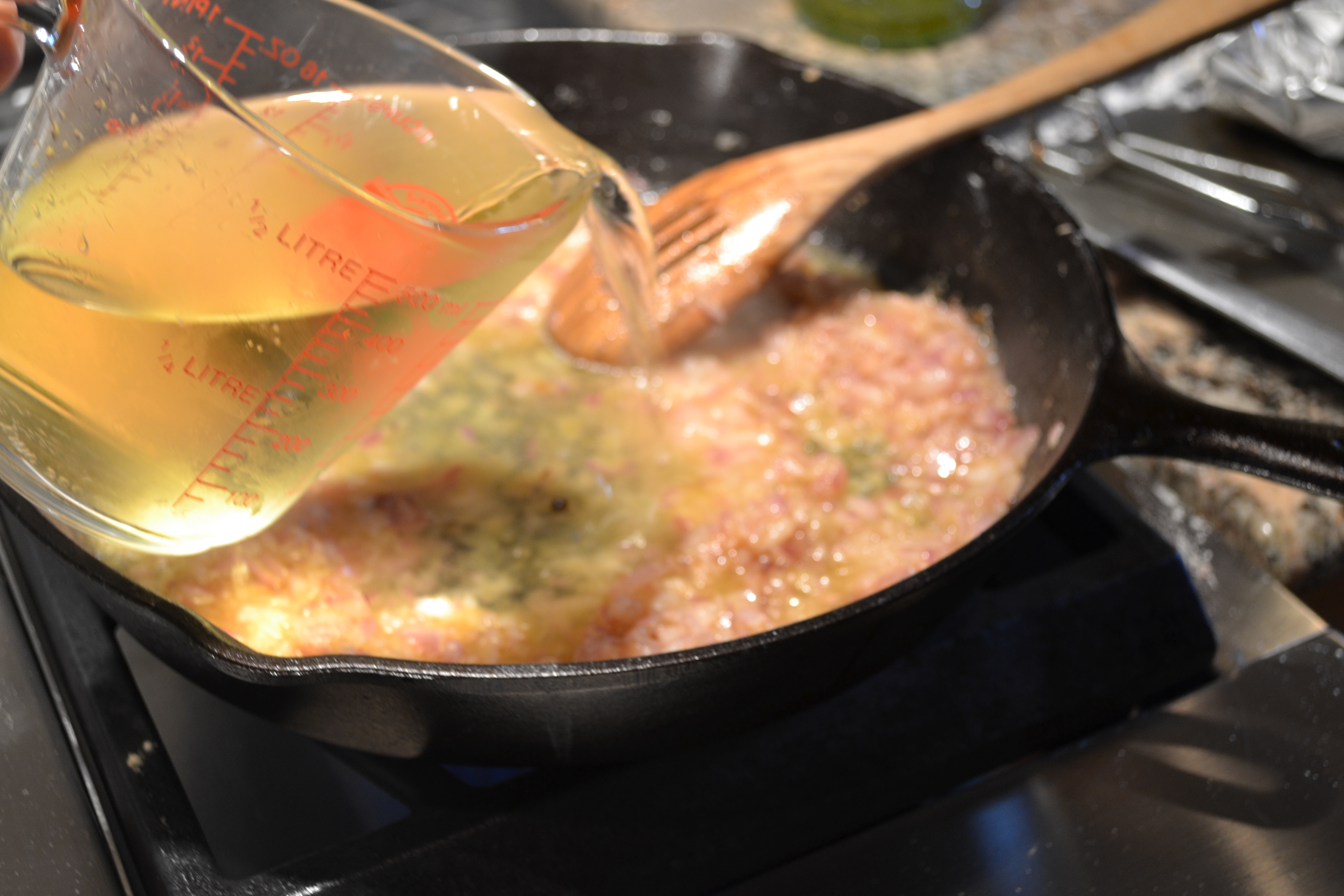 Add onion to pan and sauté until translucent, scraping up yummy browned bits. Deglaze with a splash of cognac, continuing to scrape up bits.