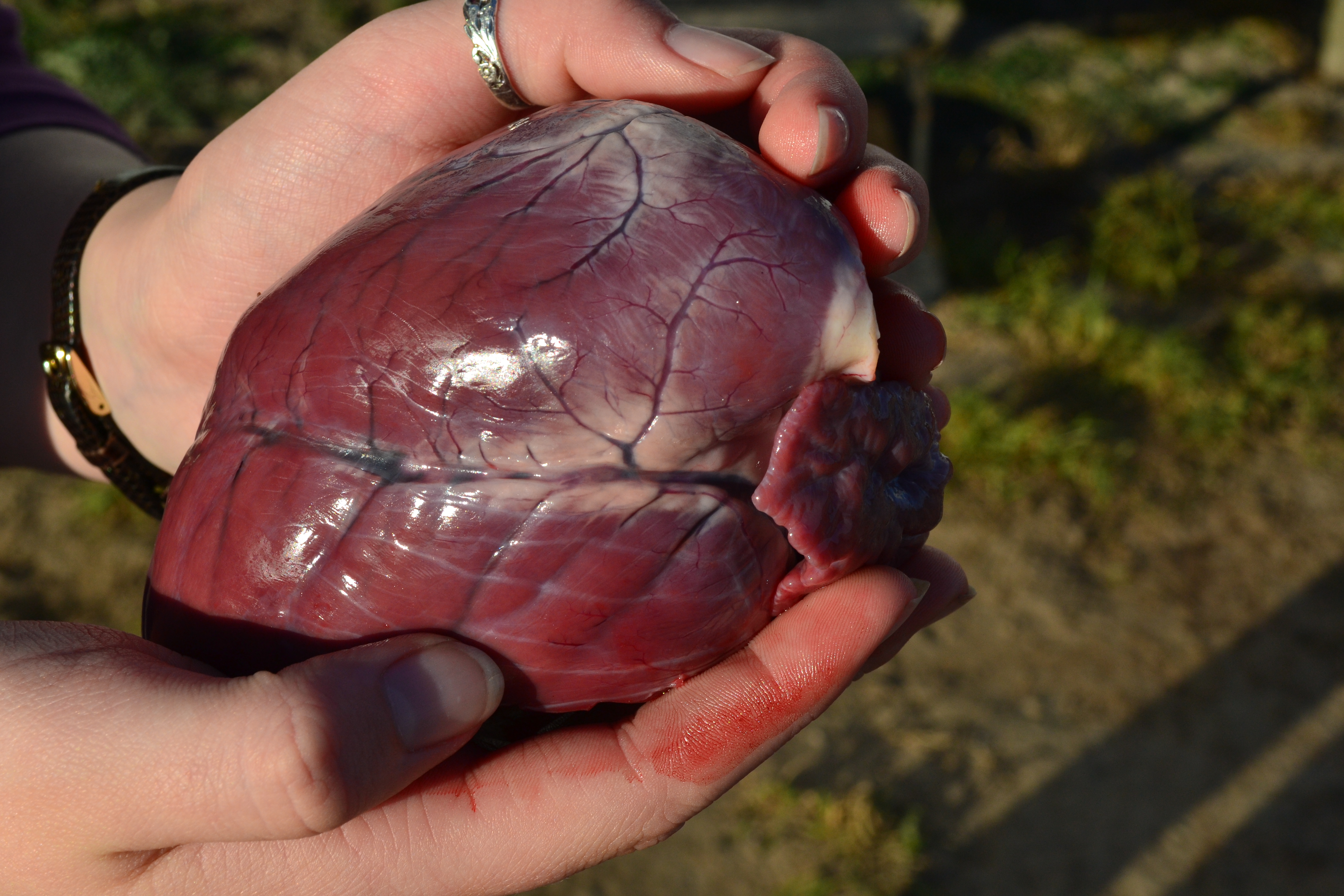 Rinse heart thoroughly. Be sure to clean out any blood clots which can sometimes be in ventricles. Trim white membrane from muscle.