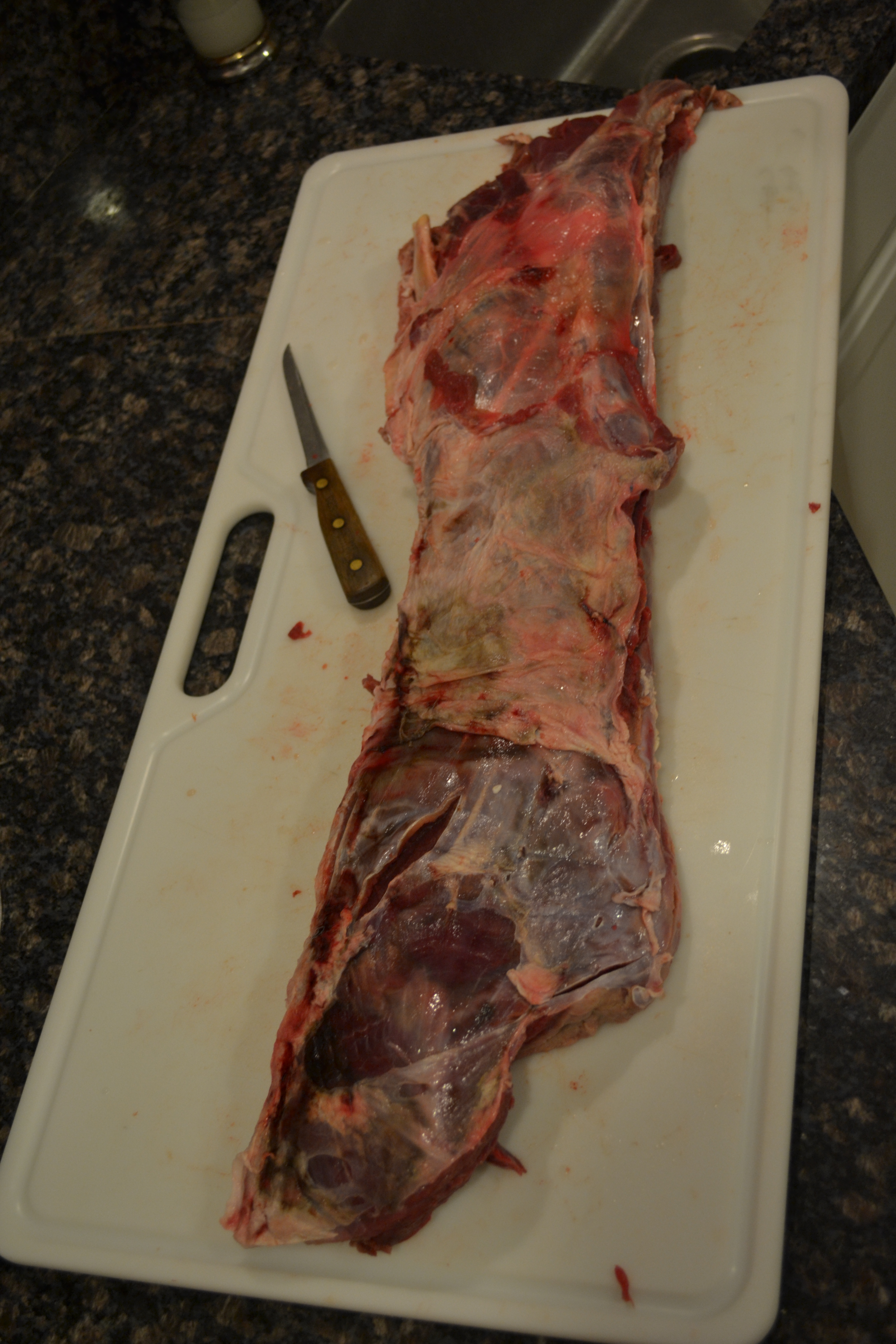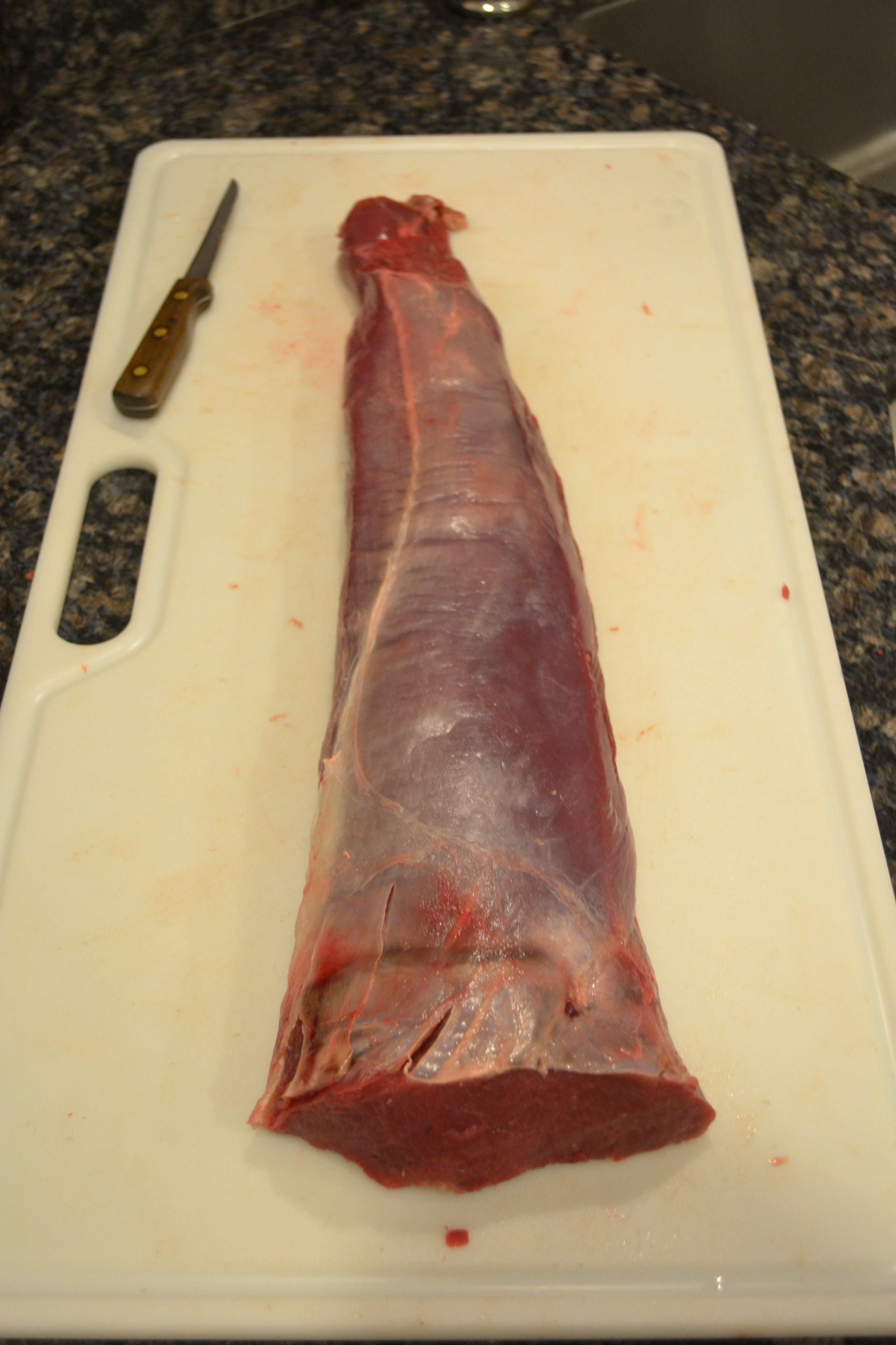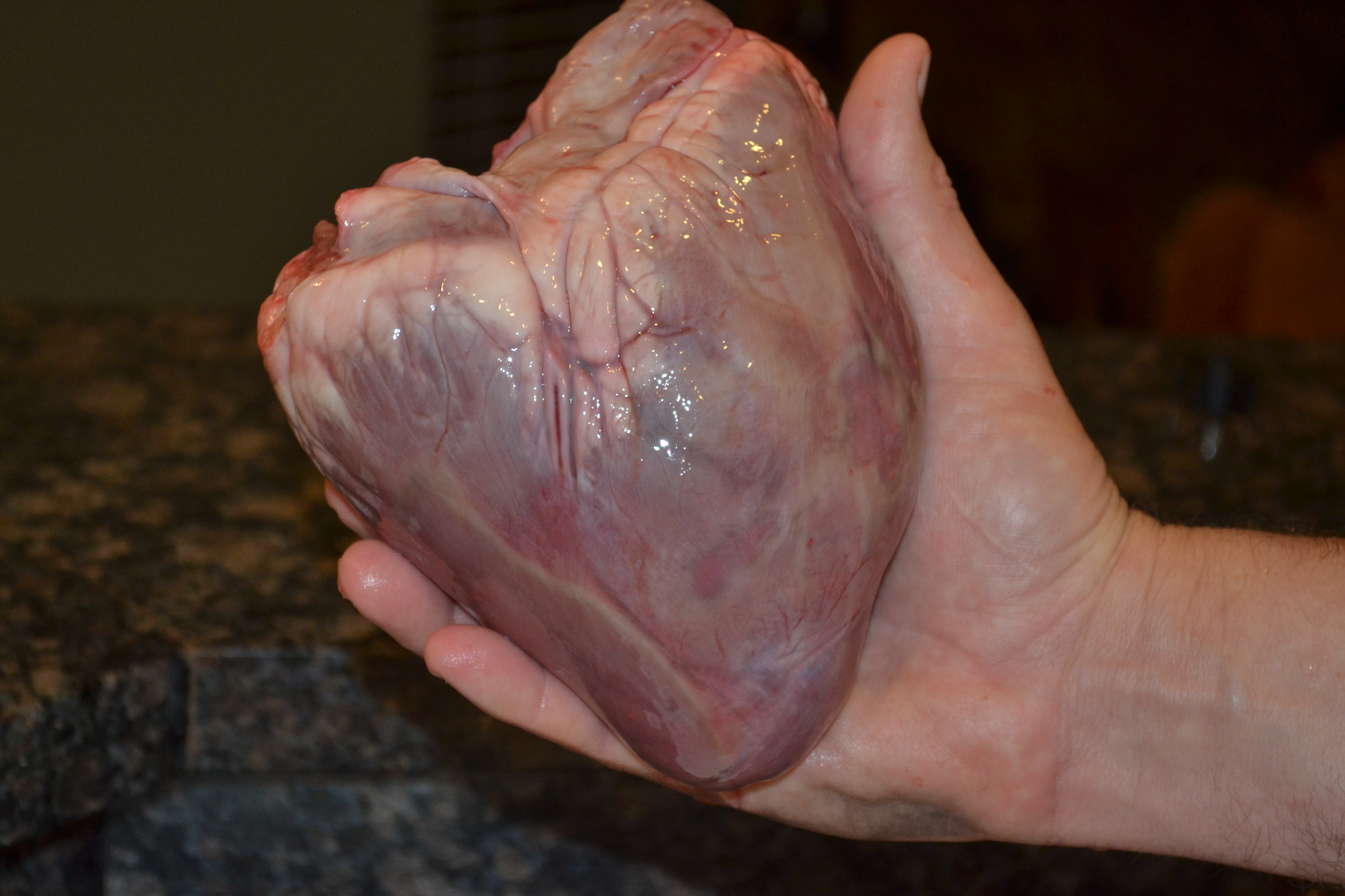 The backstrap is pictured on a cutting board that measures 32 inches. It was a refreshing surprise to discover that a prized cut of meat like backstrap, one that, if referring to venison, is set aside for a couple of special meals. will provide several delectable meals for 4 to 6 people. I felt like Jack (of beanstalk fame) in the giant’s castle. Everything was so much bigger than I was used to. Suddenly, I had at my disposal two to three times the best cuts of meat. The heart was enormous! Deerslayer is holding it in this picture. It will be prepared just as I would a deer heart.