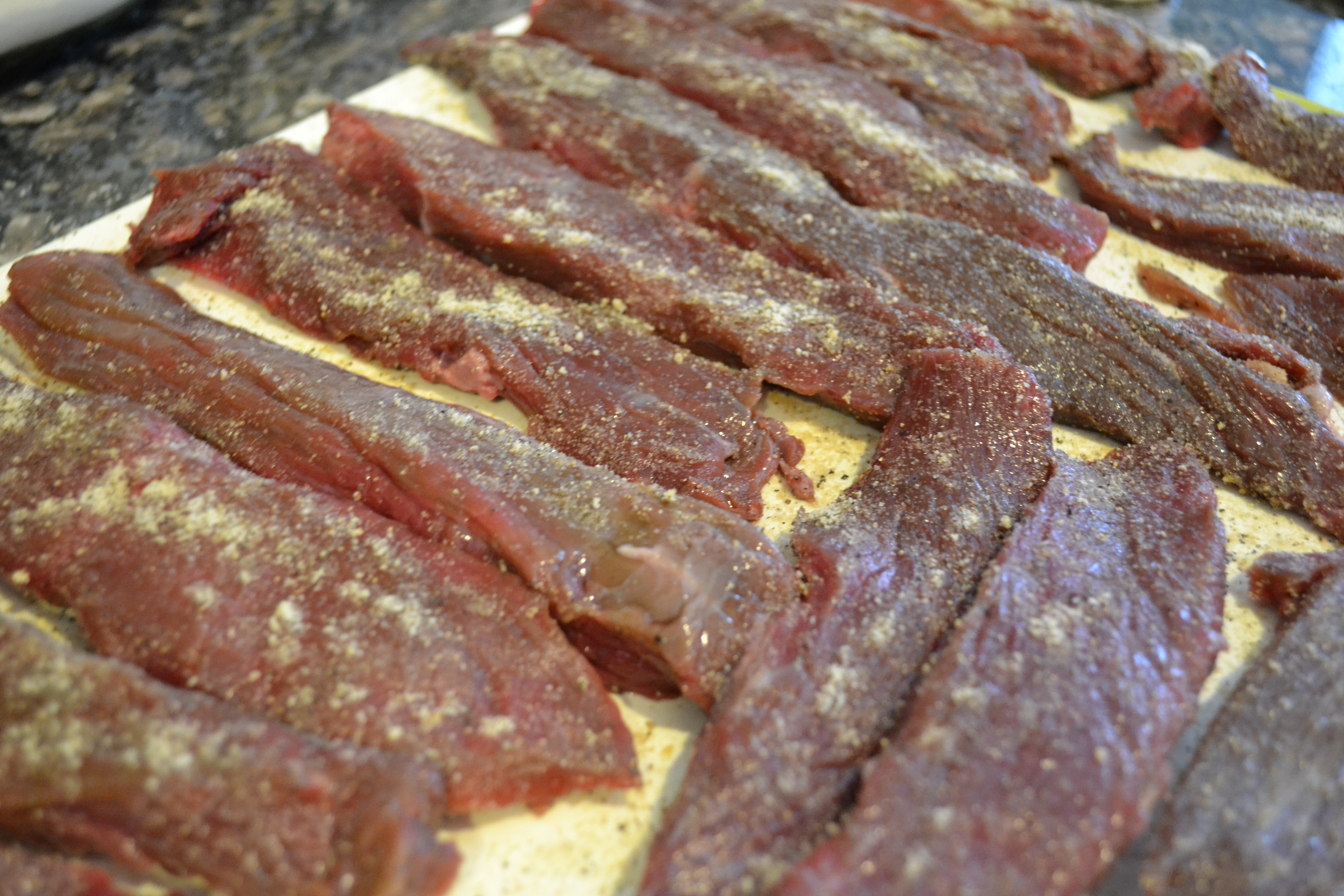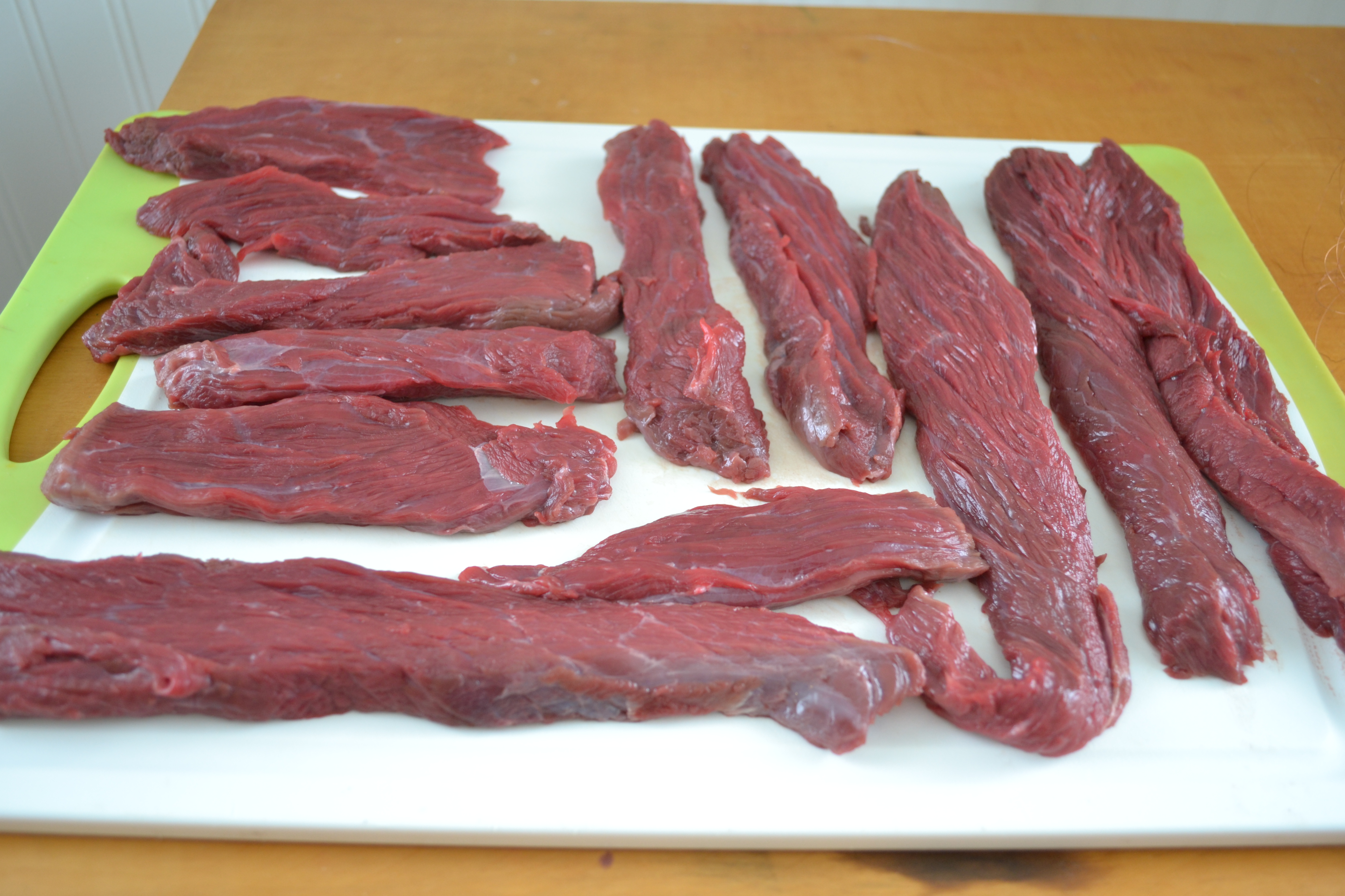 There are several large muscles in the hindquarter of large game animals that lend themselves nicely to this process. Smaller muscles will often have sinew, silver skin, and fascia that marble through the meat creating an unpleasant “flossing effect” when trying to eat the jerky.