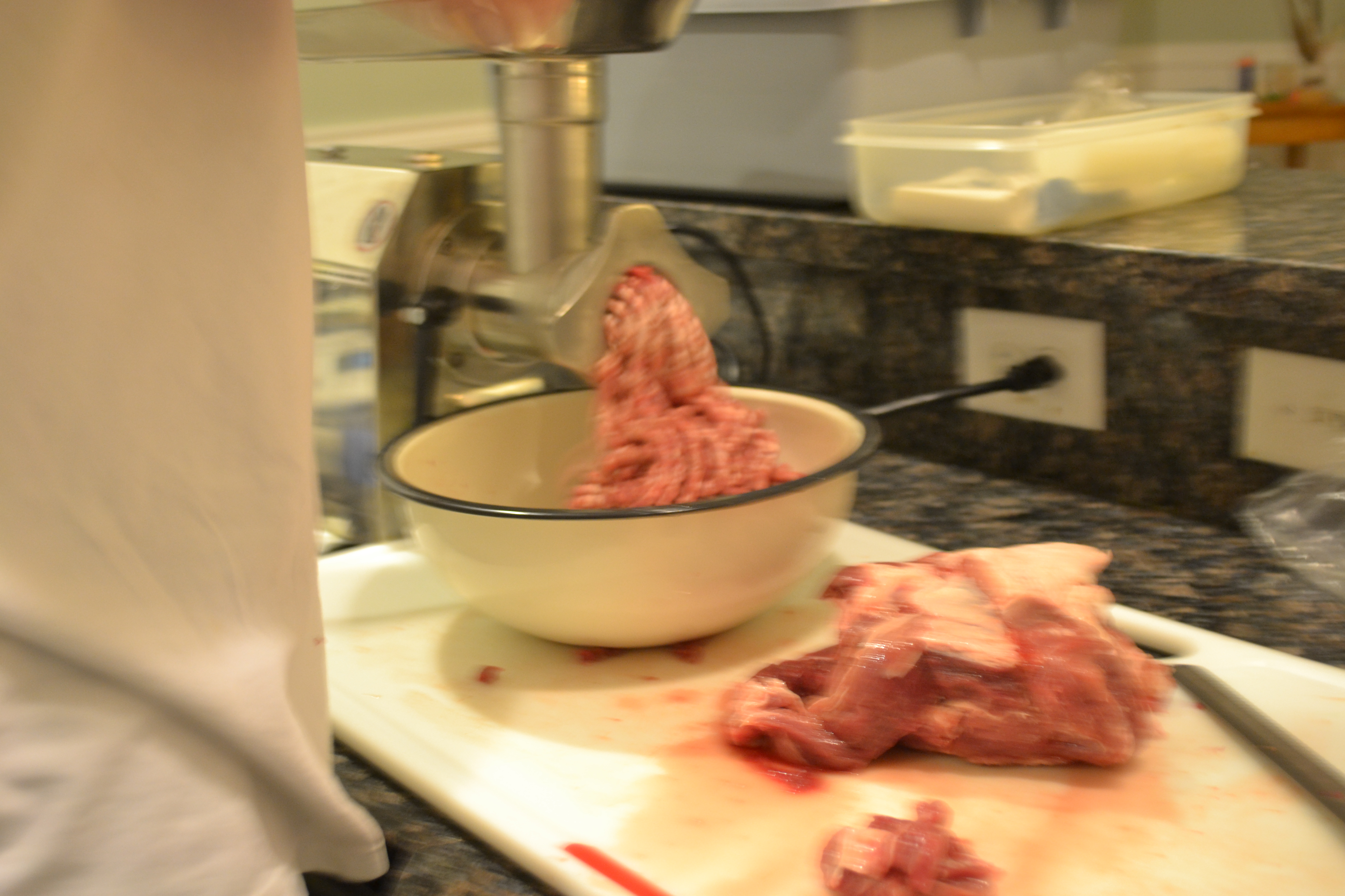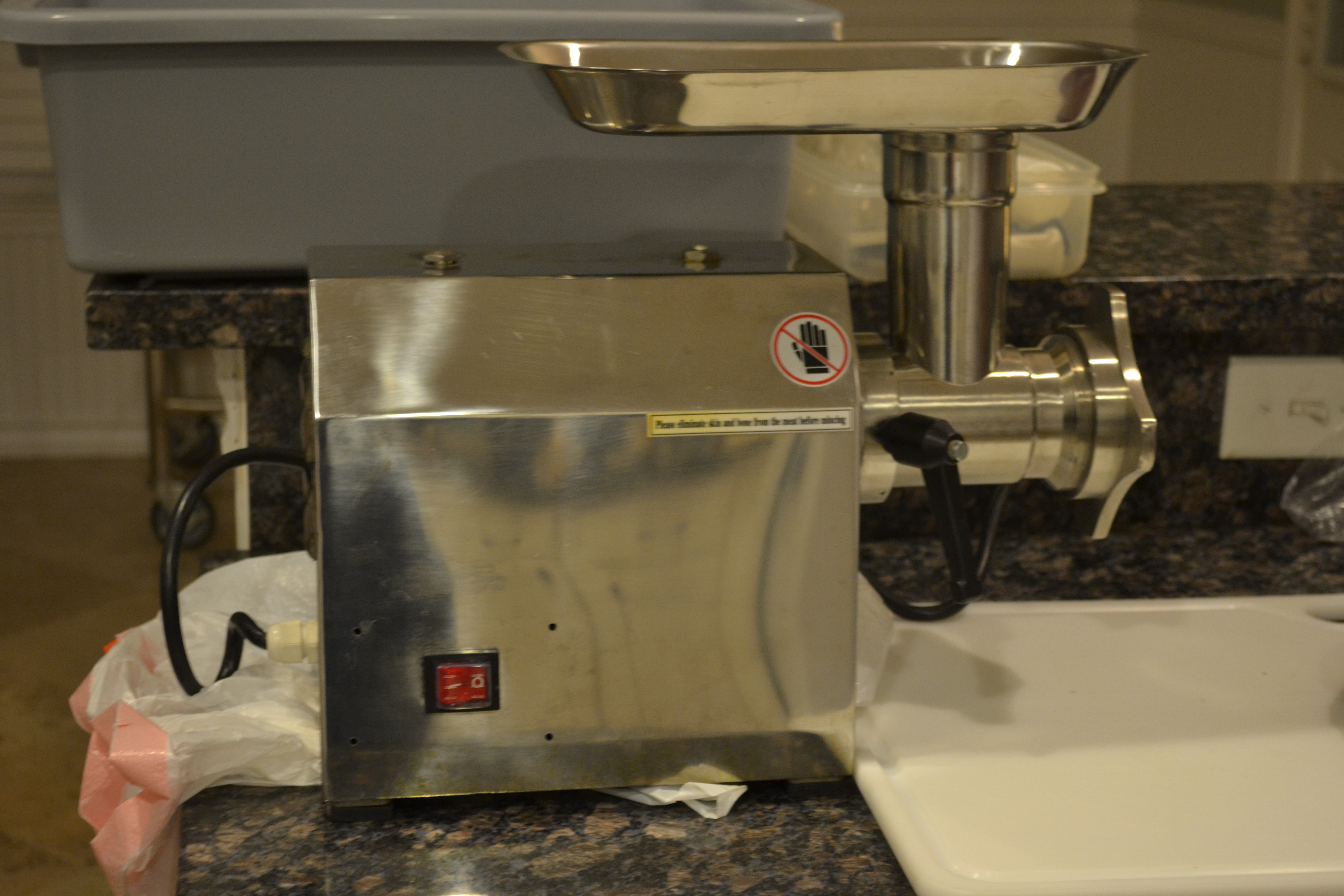 When we first started processing our own meat, we asked for a hand-crank grinder for Christmas. It was so retro and “off-the-grid” and cheap. After much grinding (get it?) and gnashing of teeth (and cursing) we gave up.  We didn’t have much success with it.  It was really labor-intensive and it kept clogging up with the fascia and sinew.  Finding a means to stabilize it was another issue.  While there are usually places in the garage that a grinder can be clamped or immobilized, the sanitary environs of the kitchen are really the best bet.