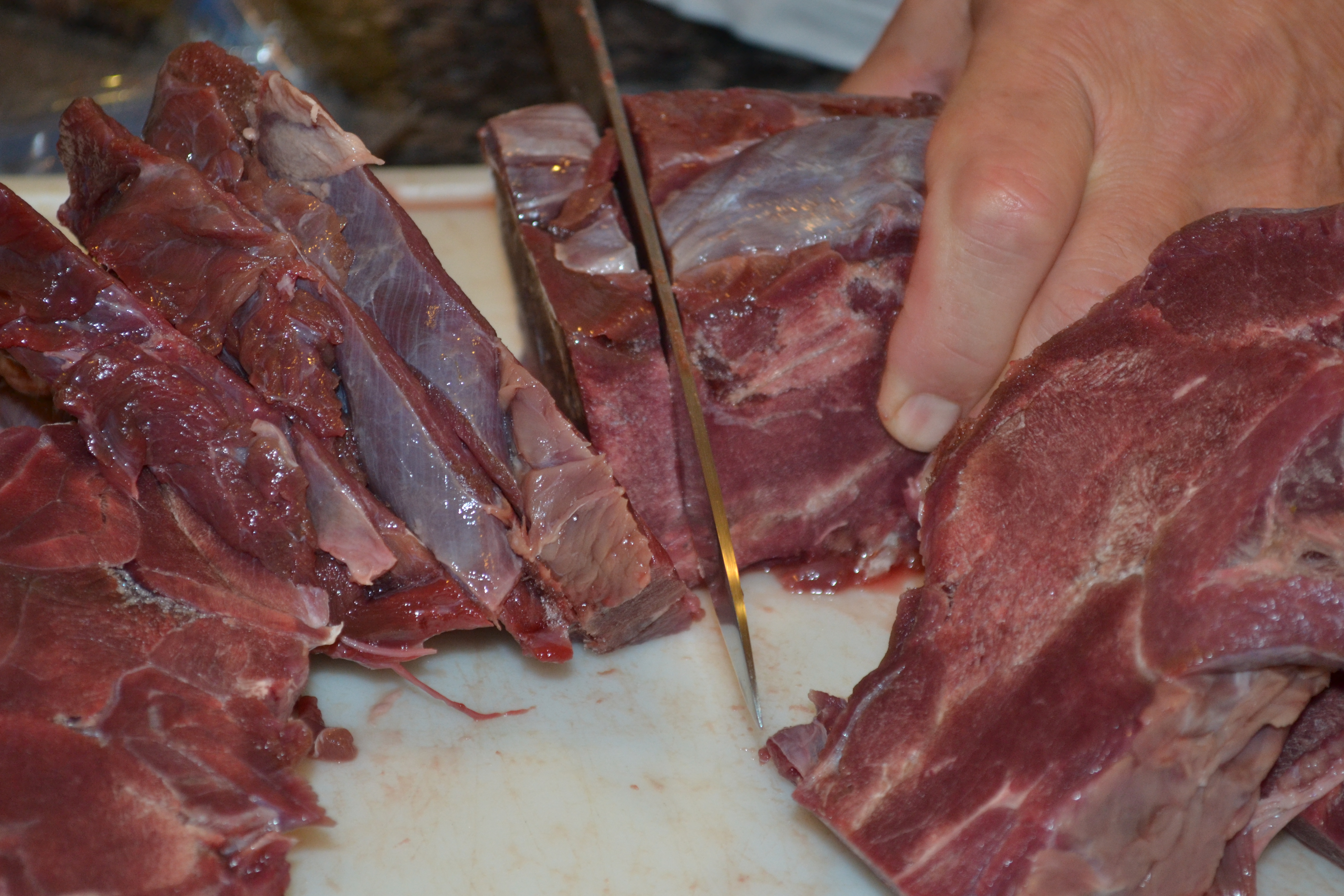 Meat should be semi-frozen when it is ground. It needs to be cut (with a serrated knife or meat saw) into pieces that will easily fit into the grinding tube.
