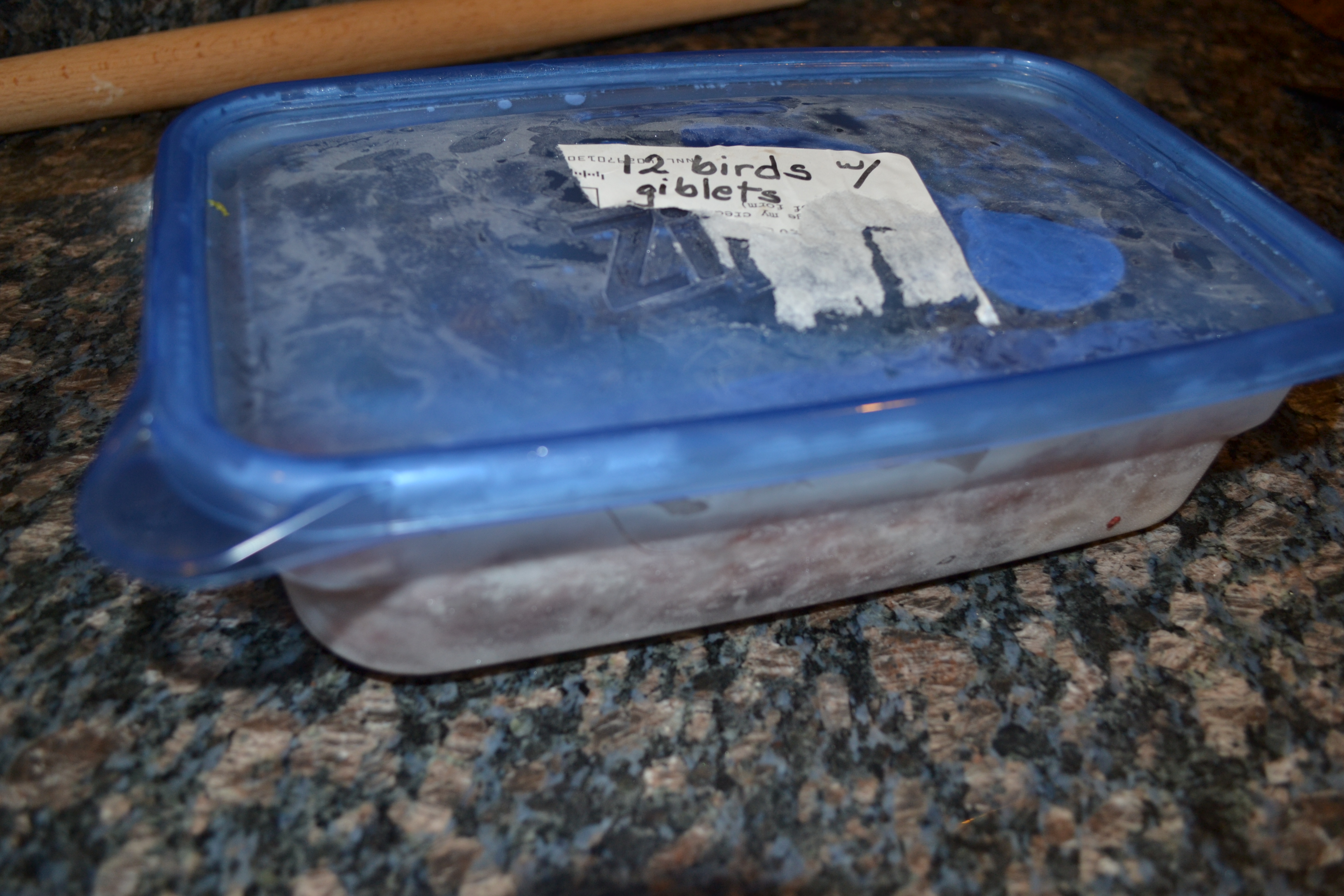 Rubbermaid makes a 6×10 container that will hold 12 birds and giblets.  I like this size because it fits nicely in the freezer and because 2-3 birds per person is just about right for our family.  The next larger size of container, 9×13, will hold about 18 birds.
