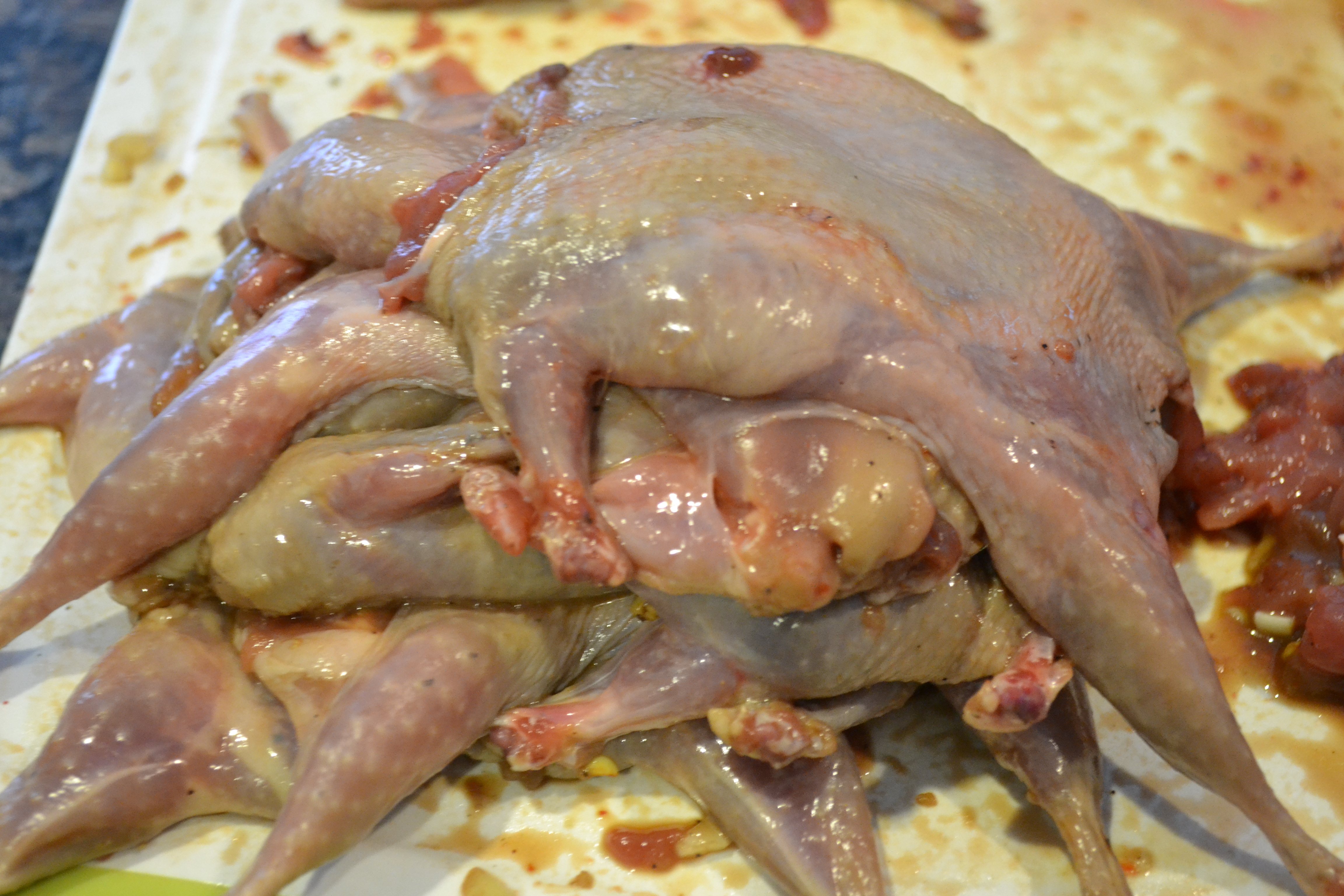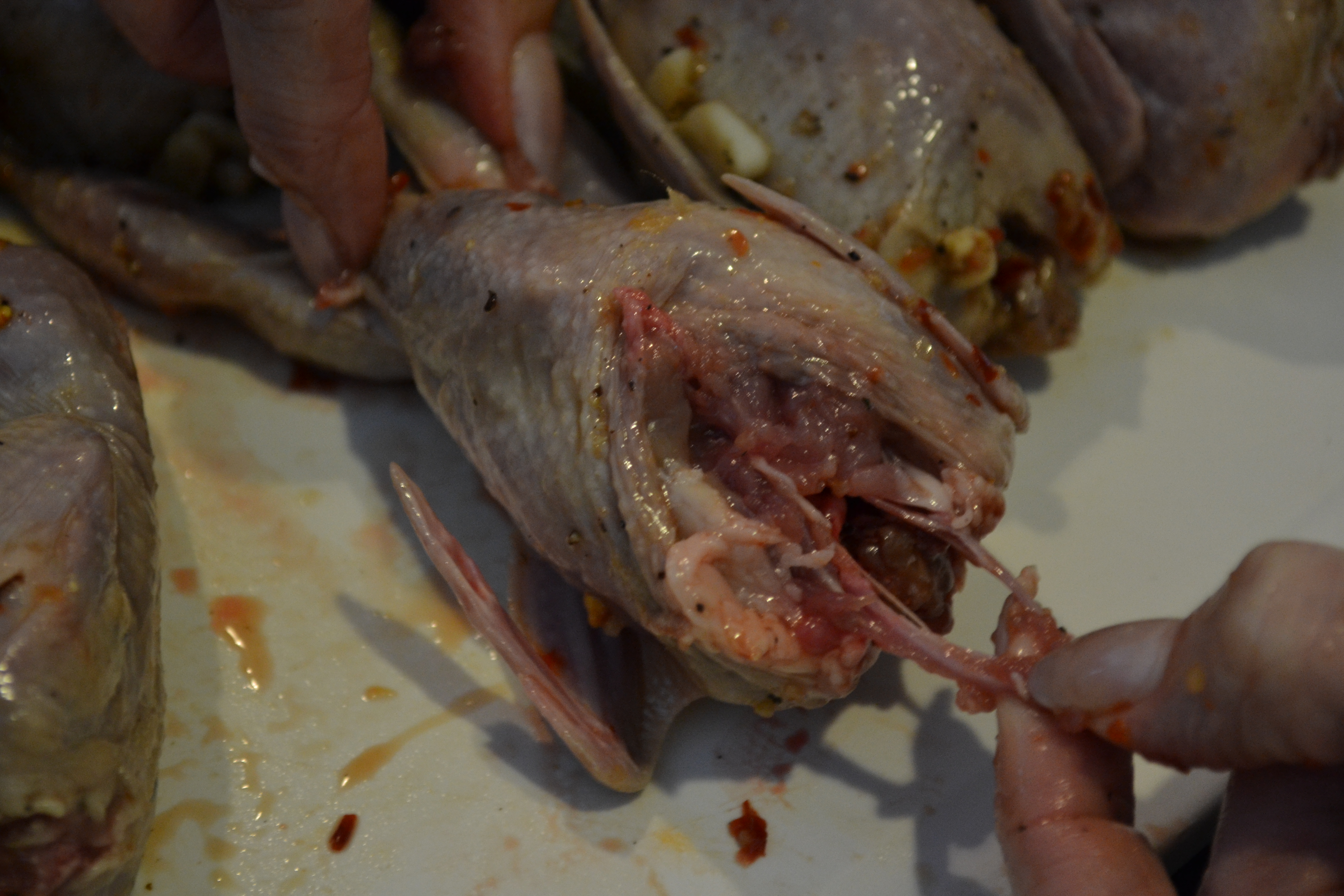 .I found a great tutorial on deboning quail from Jacques Pepin on Youtube. I wrestled a few quail before I got the hang of it. Since I was deboning more than just a couple, I found that going through a single step for all the birds allowed me to hone my skills, so to speak. For example, remove the wishbone from all 8 birds, then separate the wing bones from the shoulders for all eight. You get the picture. Game shears seemed to work better for me than a knife for detaching the wings and legs. Perhaps some of my readers feel more comfortable with a sharp knife for this task, but the shears did the trick for me. As I said, moving through each step for all the quail allowed me to get a little bit more proficient with each one. For me, the most difficult part was detaching the skin from the backbone, particularly near the tail. I used a butter knife to gently separate them. The skin is quite delicate and it’s best not to tear it. Several of my quail did end up with small holes in the skin, though. Keep in mind that the skin DOES seal in the juices. Nuff said.