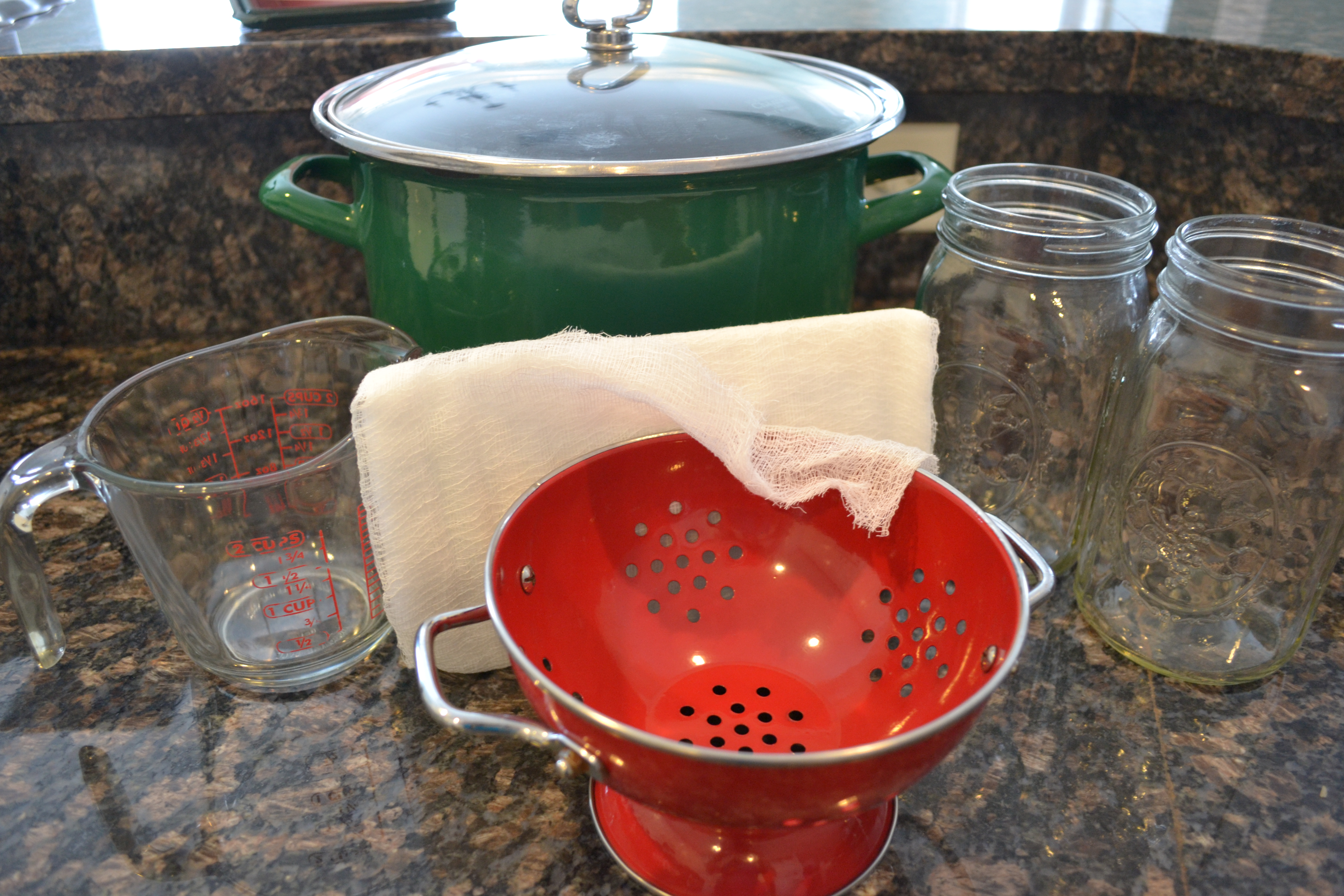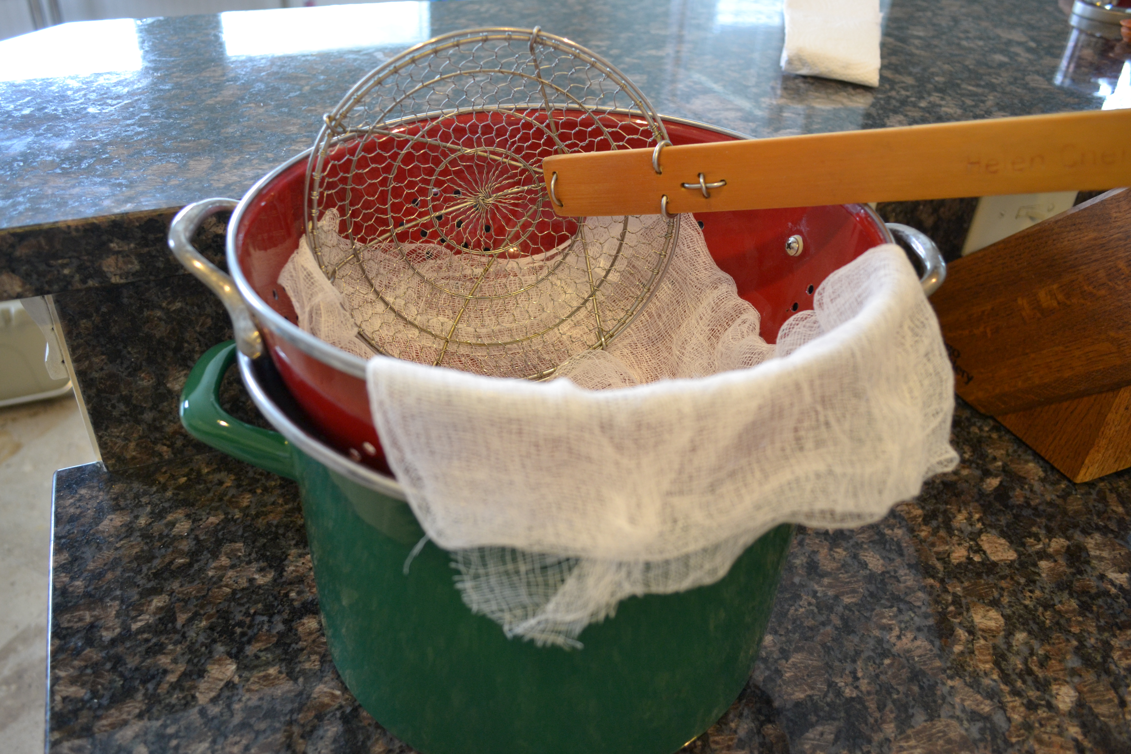 Once the stock is ready, use tongs and/or a slotted spoon to remove all bones and vegital matter. At this point, line the collander with several layers of cheese cloth and strain the stock into the second stockpot.