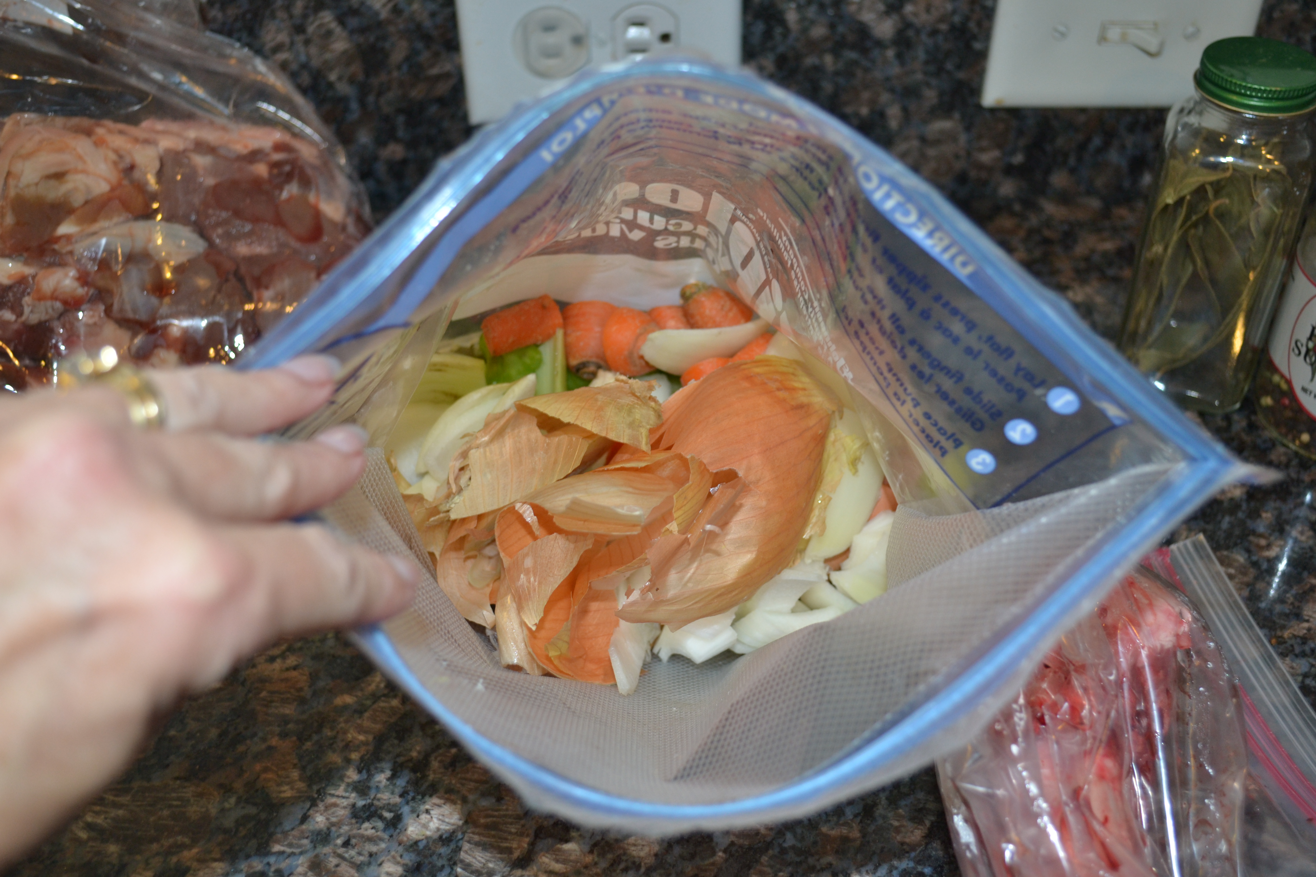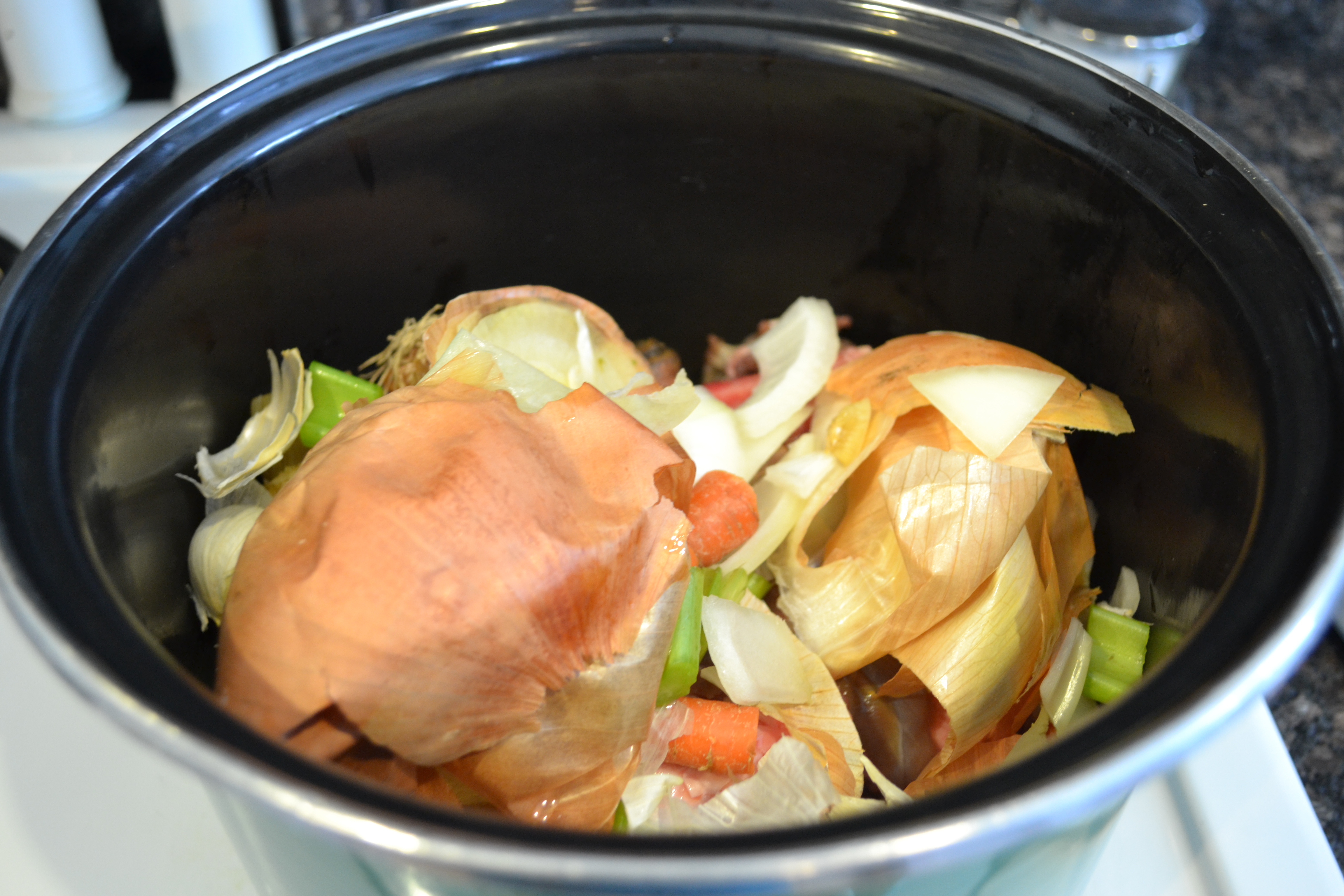 Once I embraced the “be cheap, do good” mindset (and had some awesome bones in the freezer), I took it one step further. Every time I chopped veggies (carrots, celery, garlic, onions), I saved the scrappy ends and skins in a gallon-sized zip-lock bag in the freezer until it was full.