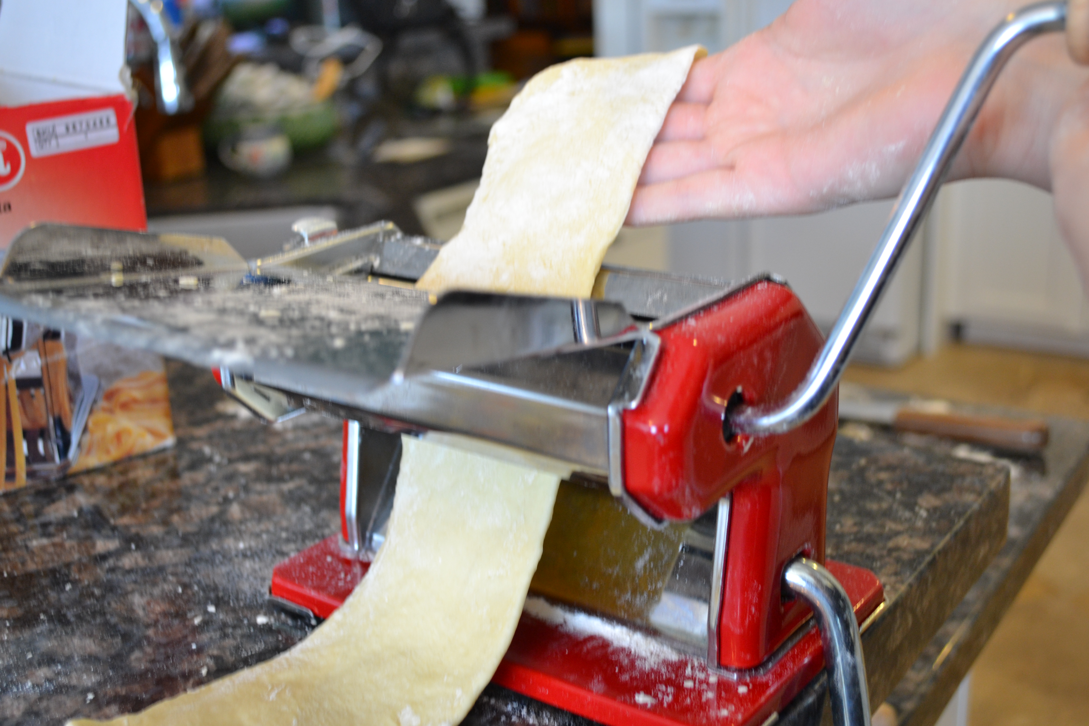 Flatten dough into a large disk. Cut into strips that can be rolled by hand or run through the pasta maker. To roll the dough out thin enough, I used my pasta maker.  It produced a uniform thickness that worked really well with the round cutter.
