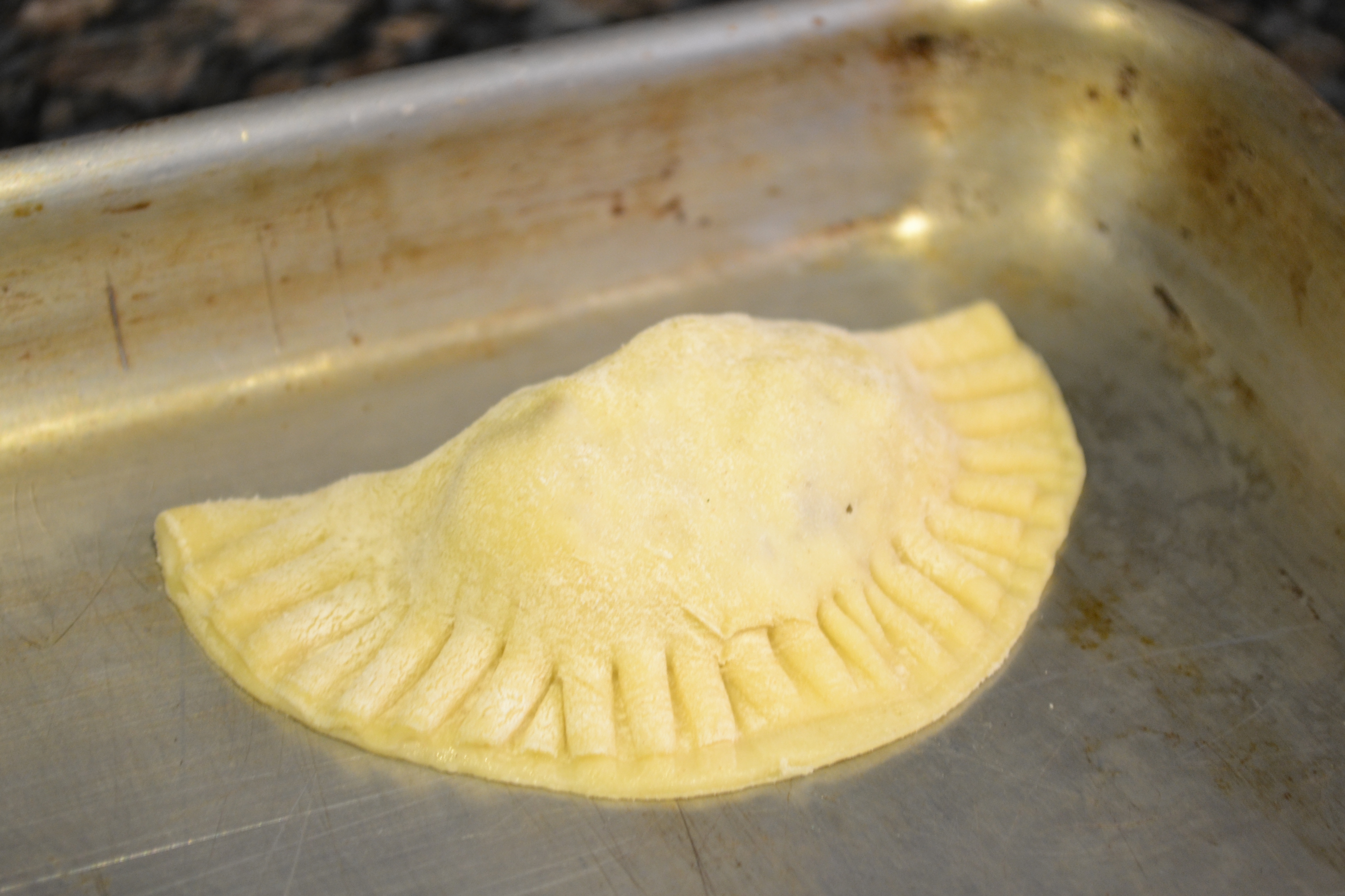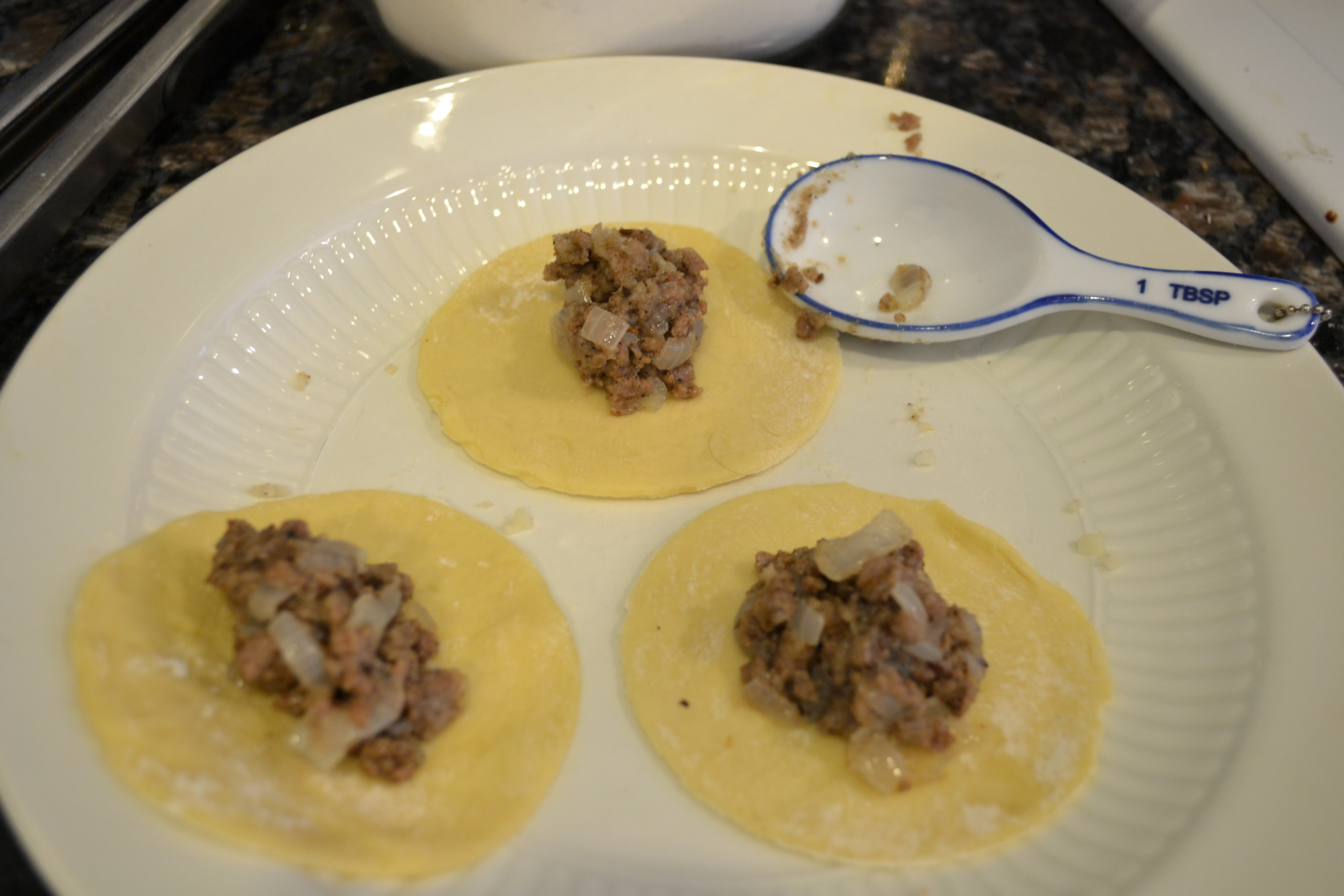 Brush water around the edges of the circle so that the pasta will adhere to itself. You may notice that the filling in this photo is potato rather than meat. Ooops.