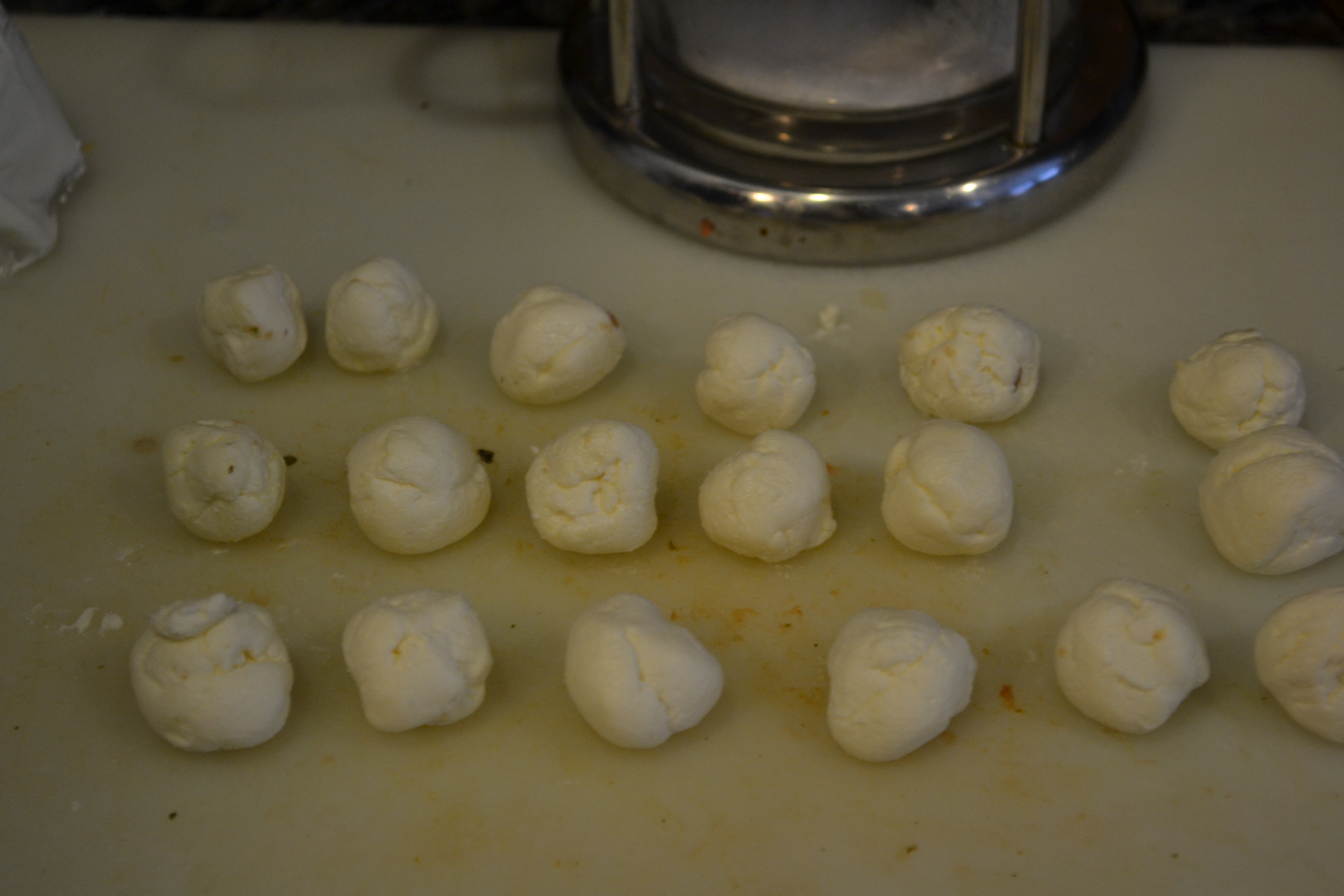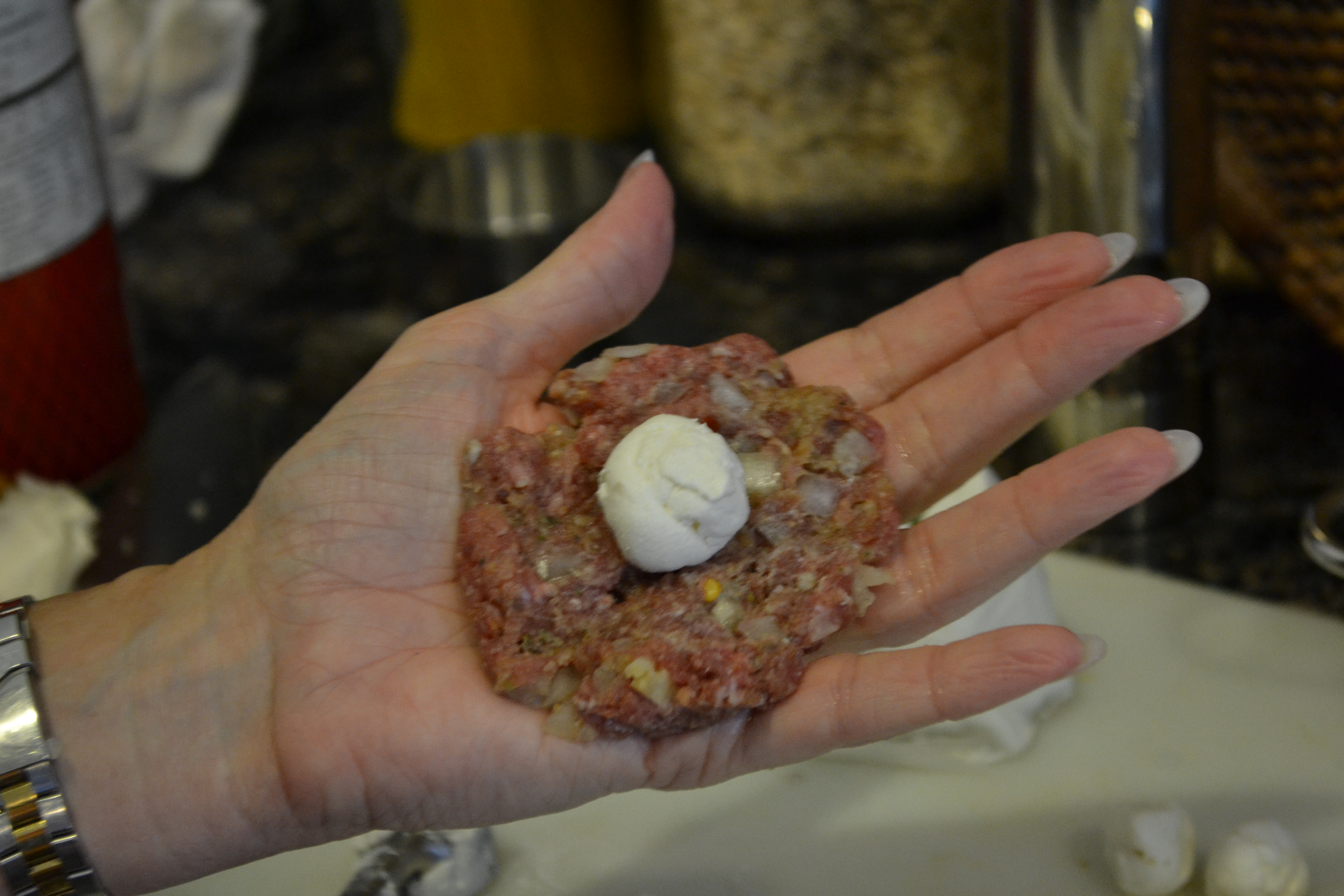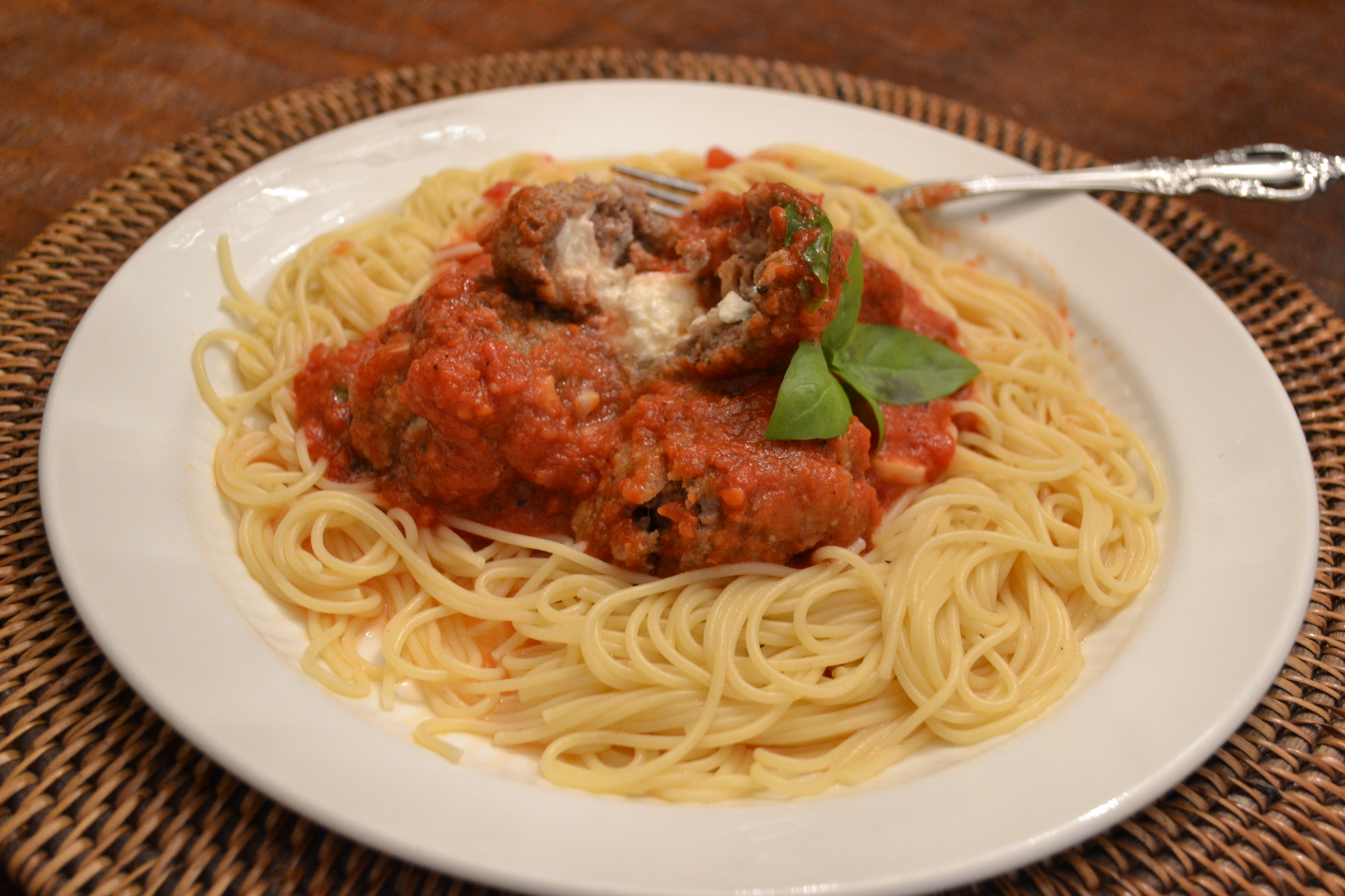One day, after a couple glasses of wine, I decided that I wanted to come up with a recipe that combined my favorite flavors into a single Deerslayer-worthy dish. Pasta with a delicious sauce full of bright, fresh flavor, and venison meatballs. Not just plain ol’ venison meatballs, though. Something spectacular, with a surprising burst of flavor! Sounds almost scary, don’t it? I was drinking, don’t forget! In a sudden brainstorm, it occured to me that goat cheese would make a perfect filling. Yup. I pulled ingredients from all over the kitchen, raced to the freezer for ground venison, and snipped herbs from the garden.