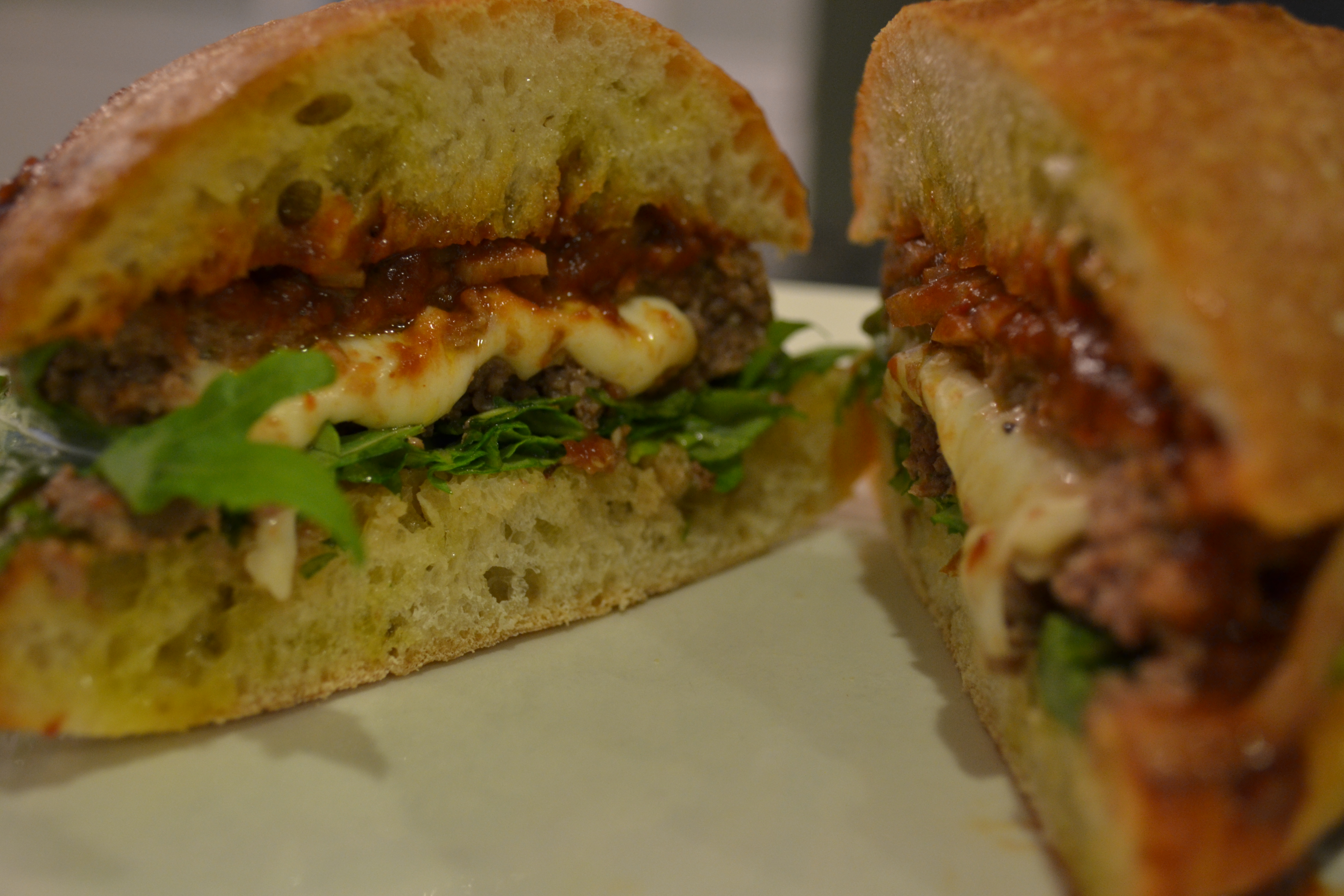 One of the daughters makes a killer spicy marinara that is a favorite addition to pasta and wild game alike. With that in mind, a little brainstorming resulted in the following recipe. Beautifully seasoned venison, sliced mozzarella, fabulously flavorful marinara, crusty ciabatta, and peppery arugula came together to create the perfect combination of flavors, the consummate burger.