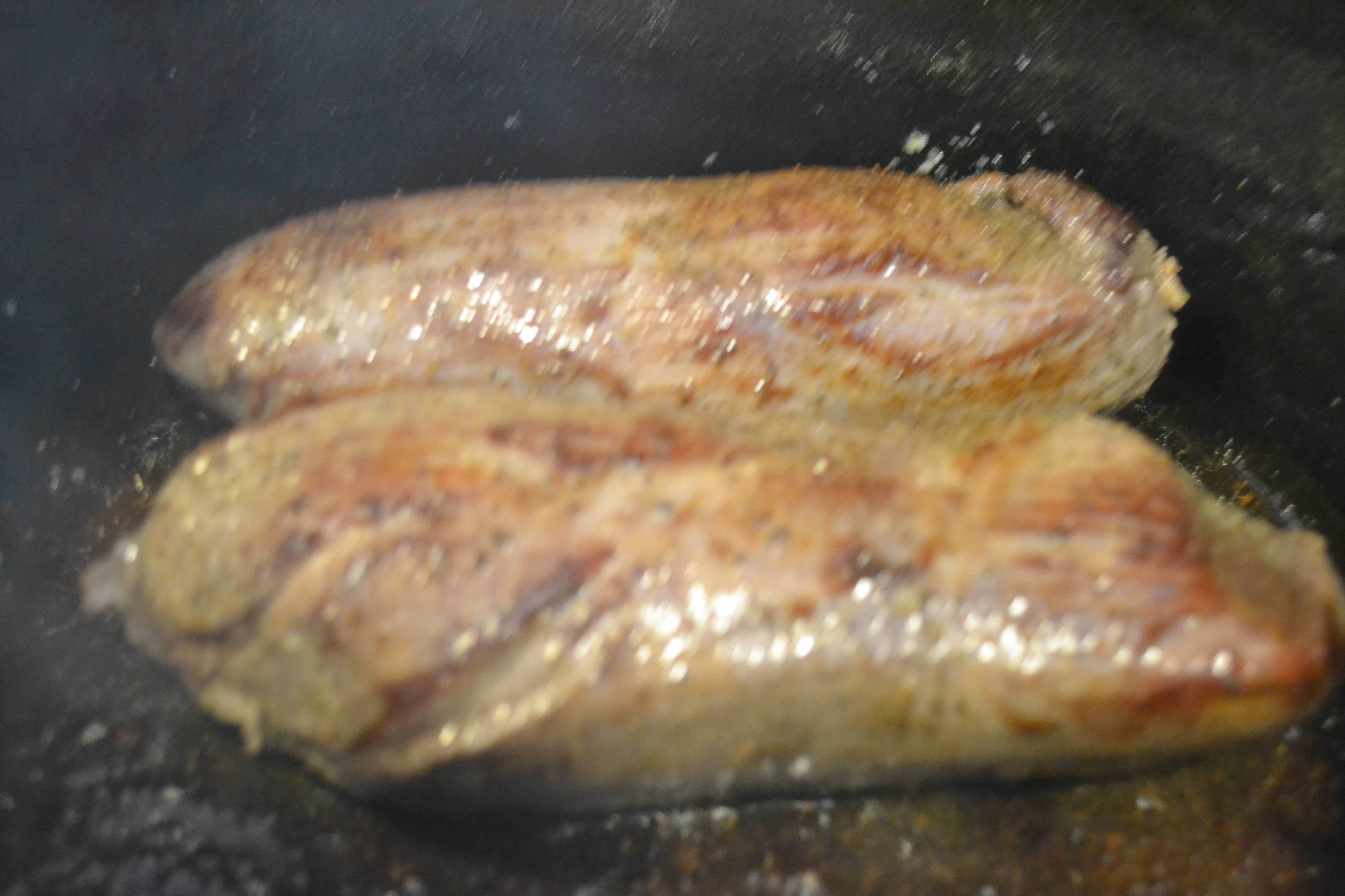 Preheat oven to 350°. Season tenderloin liberally with salt & pepper mix. Add oil to the bottom of a deep cast iron skillet.and heat oil on high. Sear tenderloin on all sides until beautifully crusted.