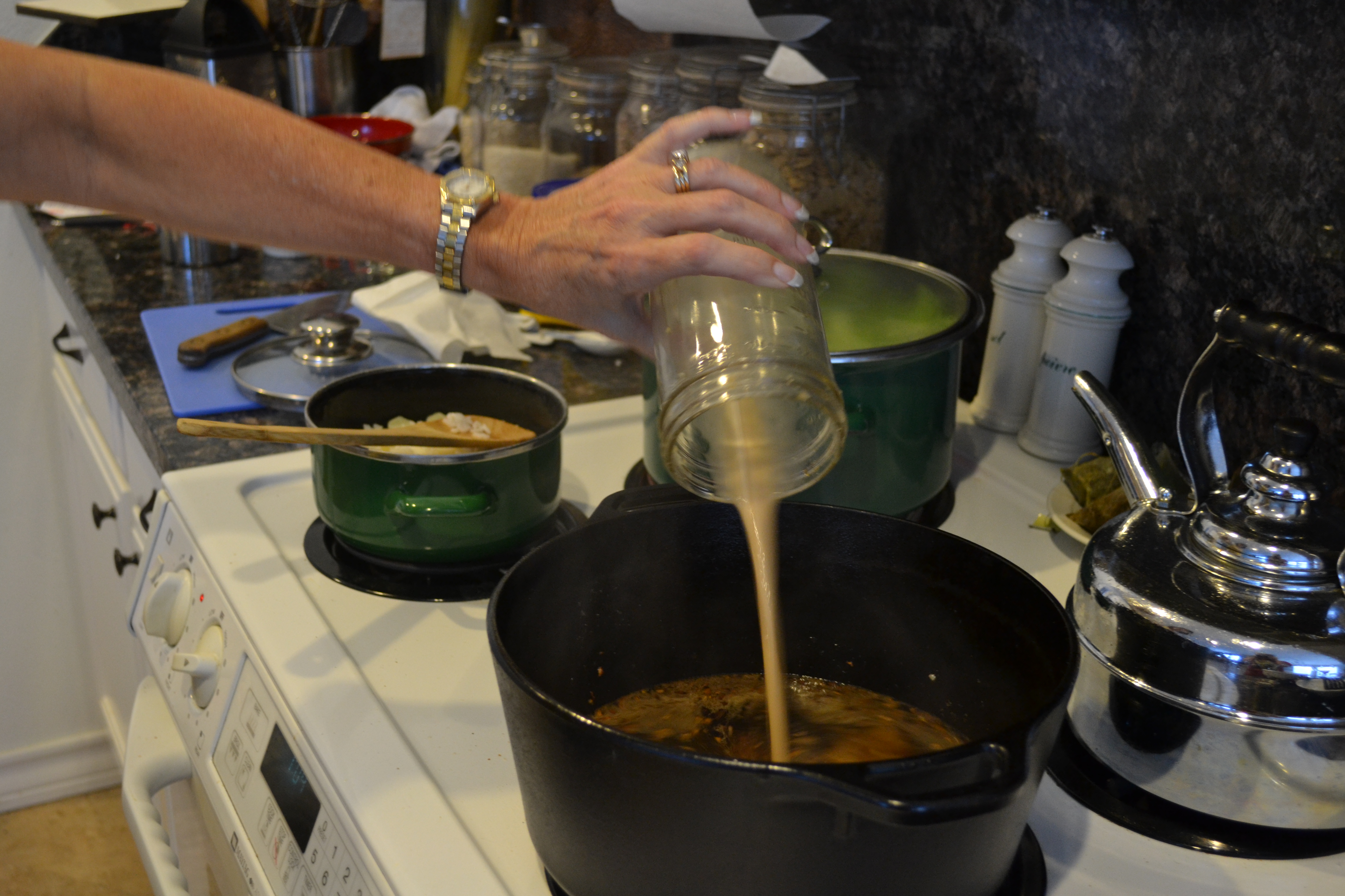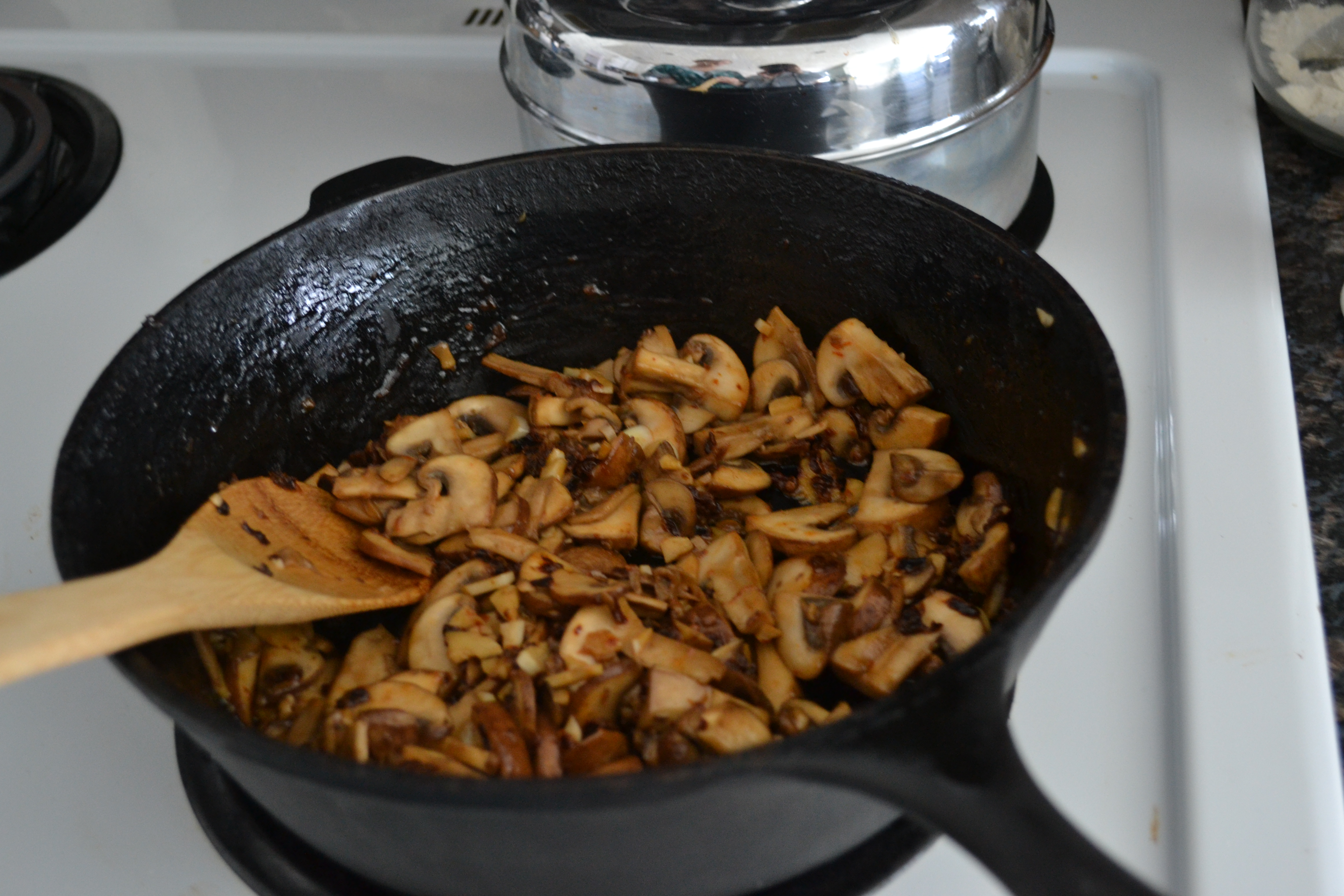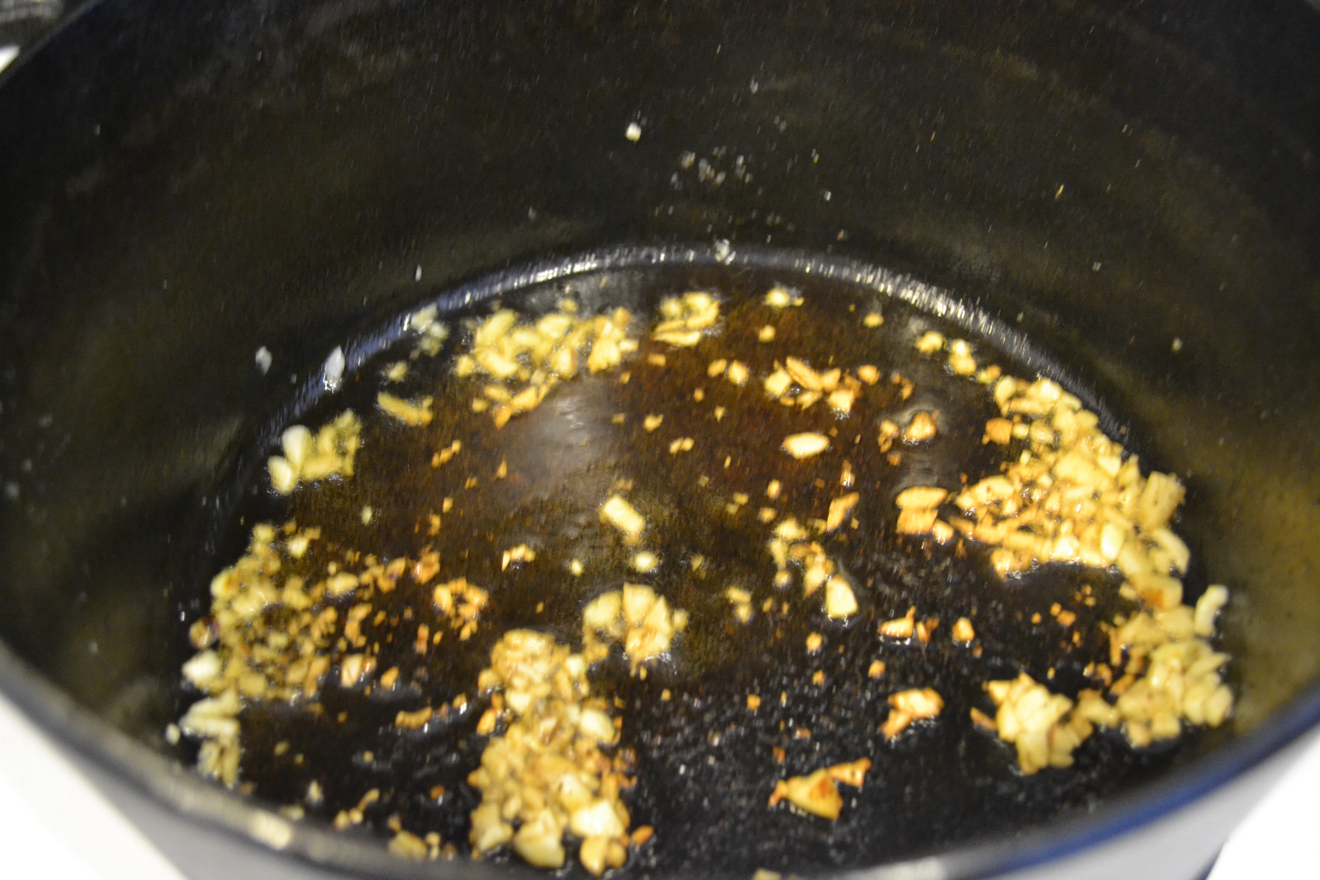 2. Saute’ onion and garlic in corn oil in a high-sided cast iron skillet.