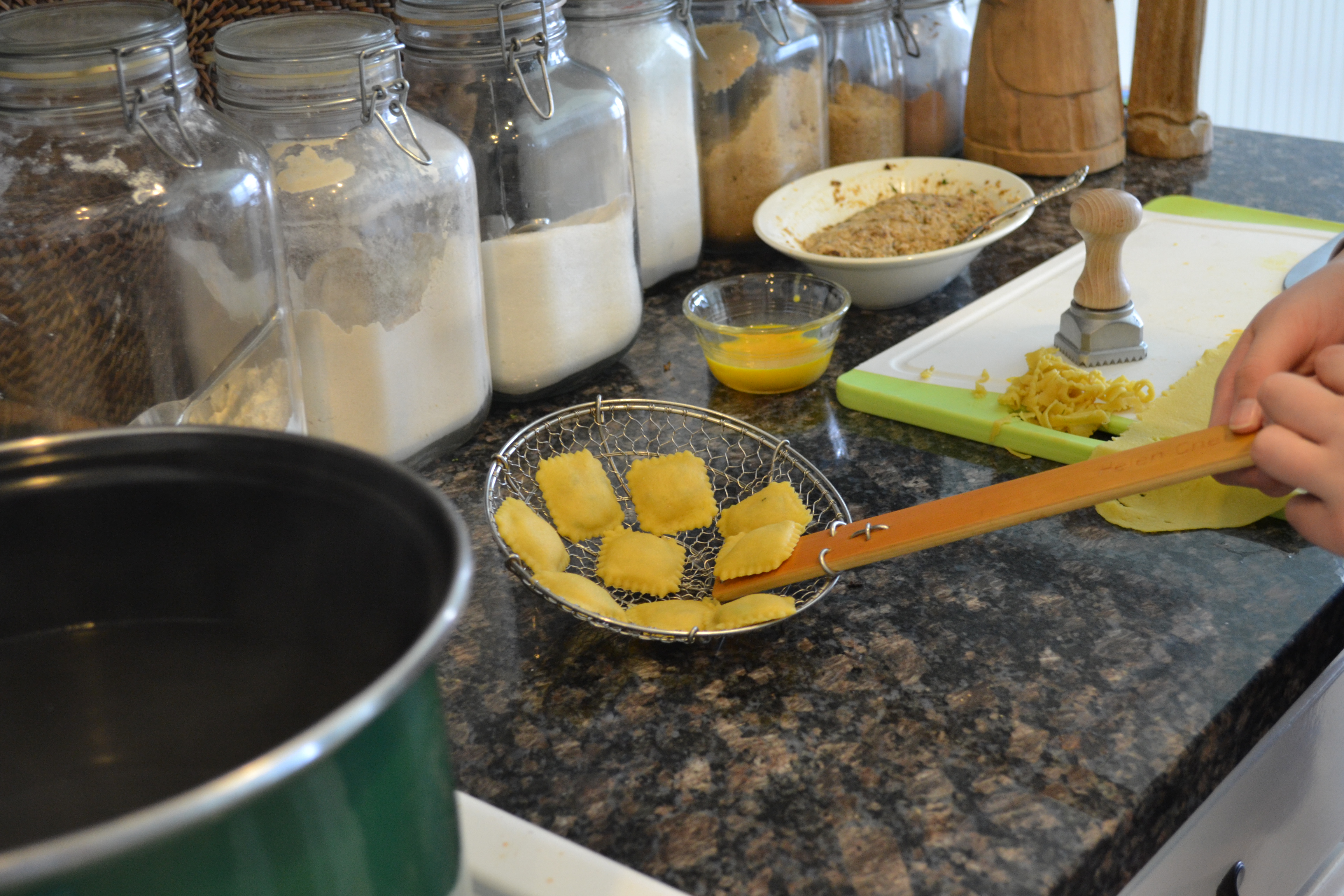 9. Bring a large pot of water, with a little olive oil, to a rapid boil. Using a slotted spoon or spider (see picture of the one I received for Mother’s Day 2010) add ravioli, a few at a time, so they don’t stick together. Reduce heat to medium.