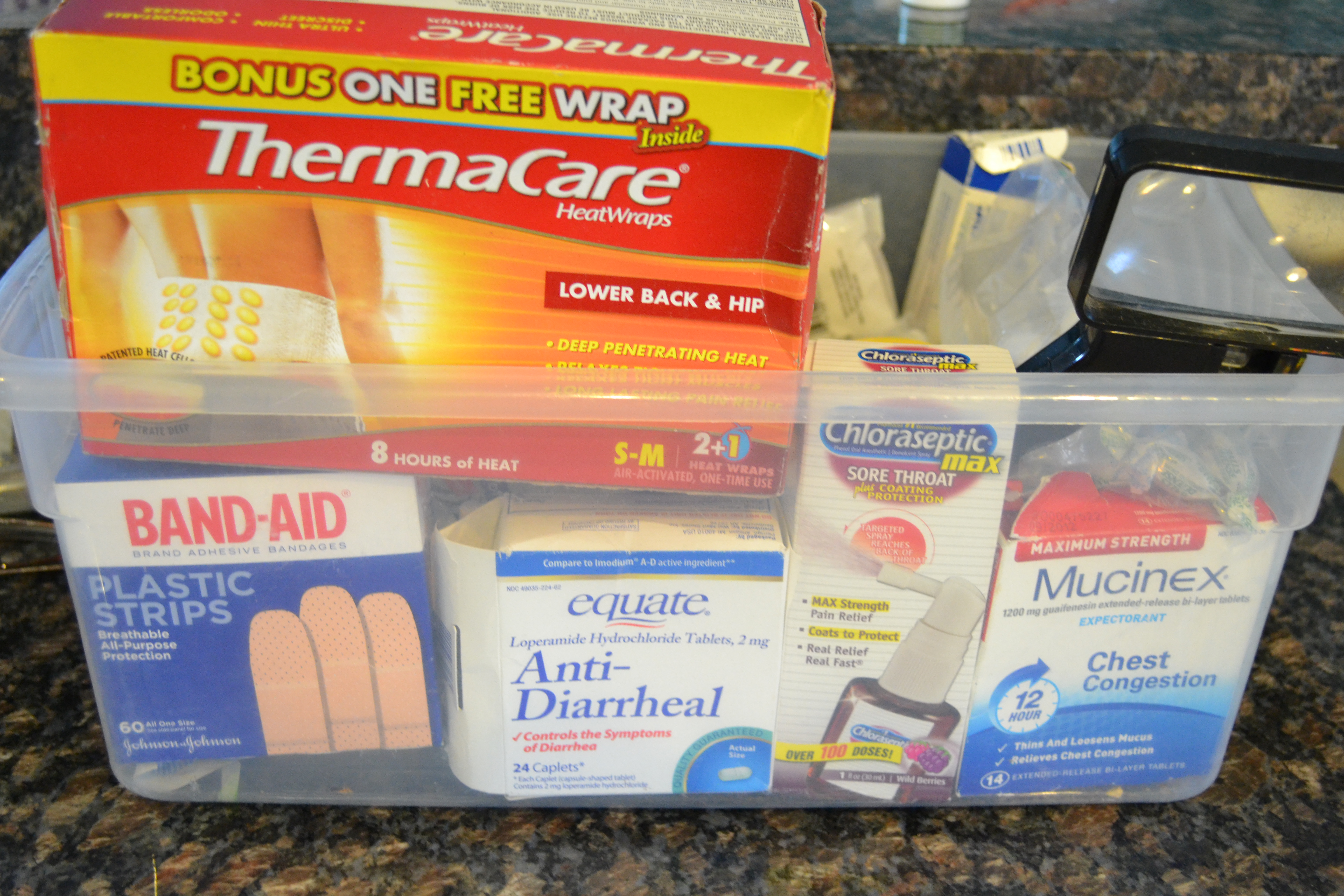 Anti-diarrheal meds, Benadryl, Sudafed, Various sore throat and cough lozenges, sore throat spray