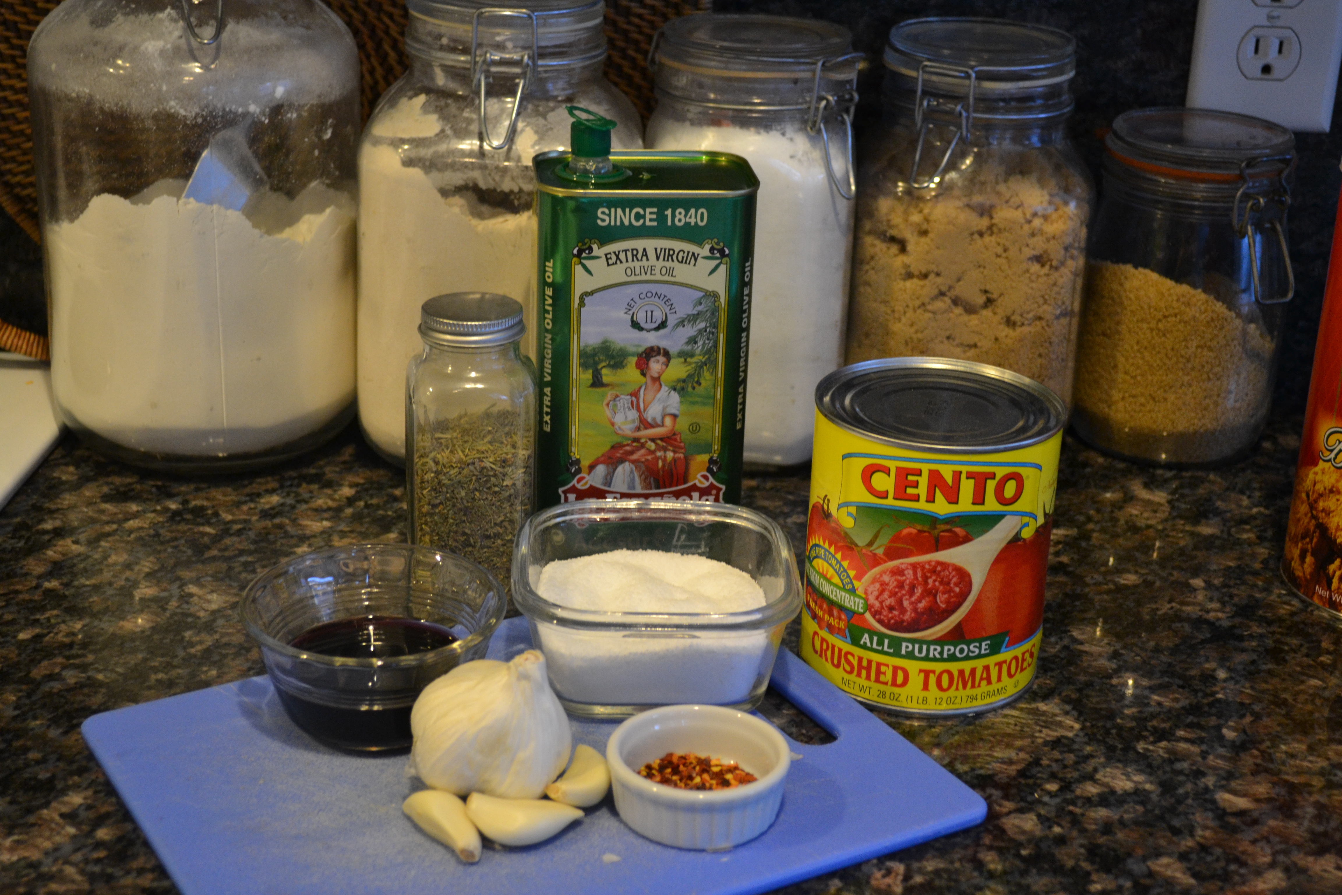 1. Saute garlic in olive oil in a cast iron skillet. Add the rest of the ingredients (except parmesan and mozzarella) and allow to simmer while the meat is prepared, about 30 minutes.