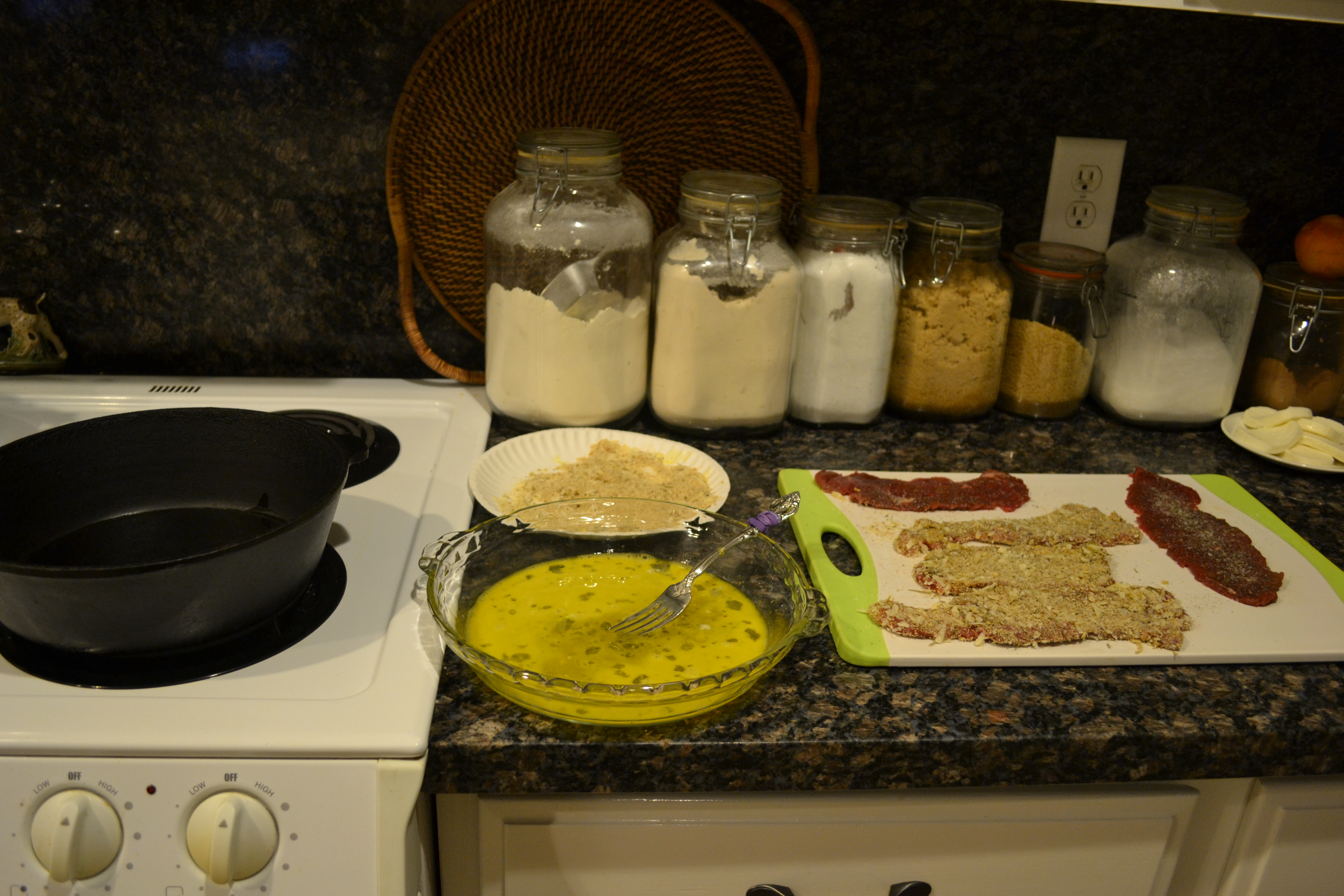 5. Dip each steak into the beaten egg and allow excess to drip off. Then dredge in the crumb mixture, patting extra into the steaks. Breaded steaks can either be returned to the cutting board or set directly into a cast iron skillet heated to medium heat with several glugs of olive oil. Allow to brown on both sides, just a few minutes