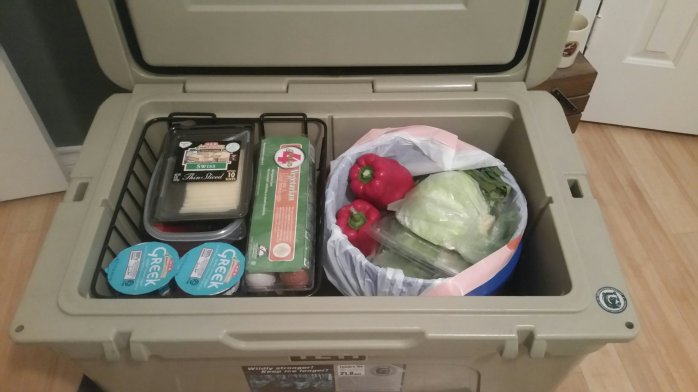 I discovered that a 5 gallon bucket from Home Depot or Lowe’s fits perfectly in one side of the cooler. When fitted with a kitchen trash bag, I can fill the bucket with produce, cheese, lunch meat, etc., anything that needs to be chilled but that I don’t want to become waterlogged as the ice melts. Heaviest or less delicate items like cabbage or blocks of cheese can go on the bottom. Easily bruised produce and other delicate things can rest up top.