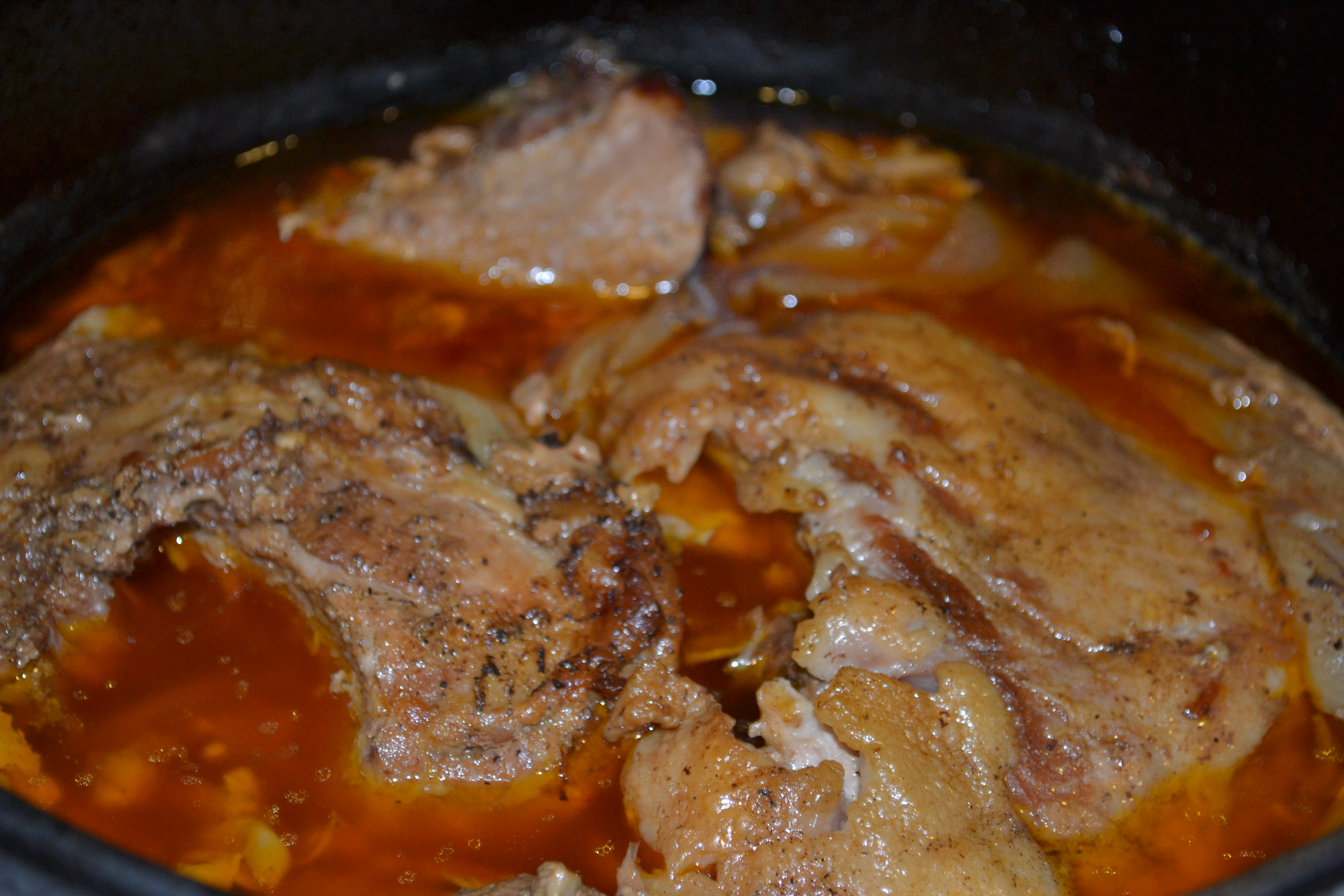 Liberally season with salt and pepper mix a large “hunk o’ pork” that will fit into your dutch oven and leave room for the lid to fit on without touching the meat. Be sure to season all sides. Place meat on top of onions.