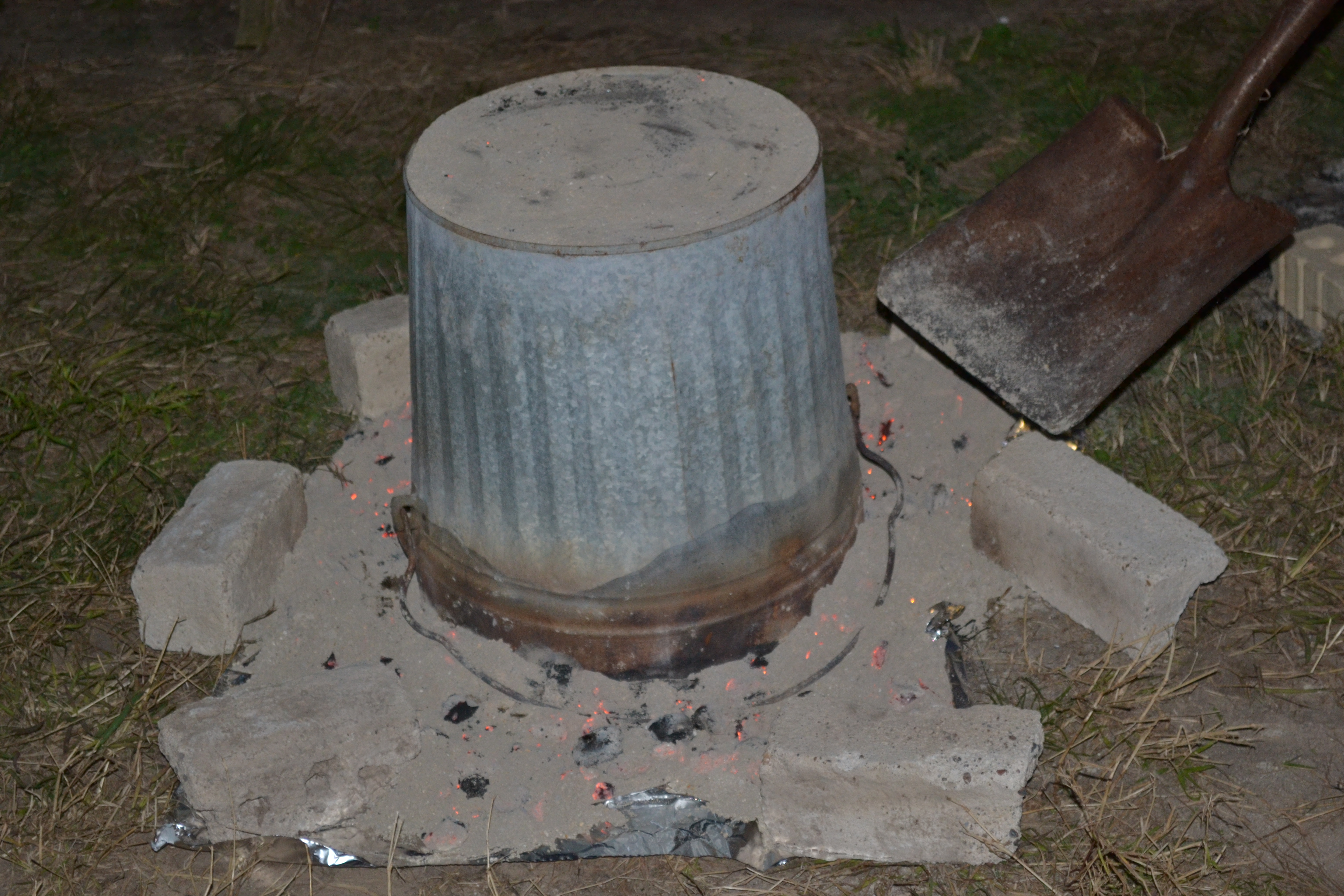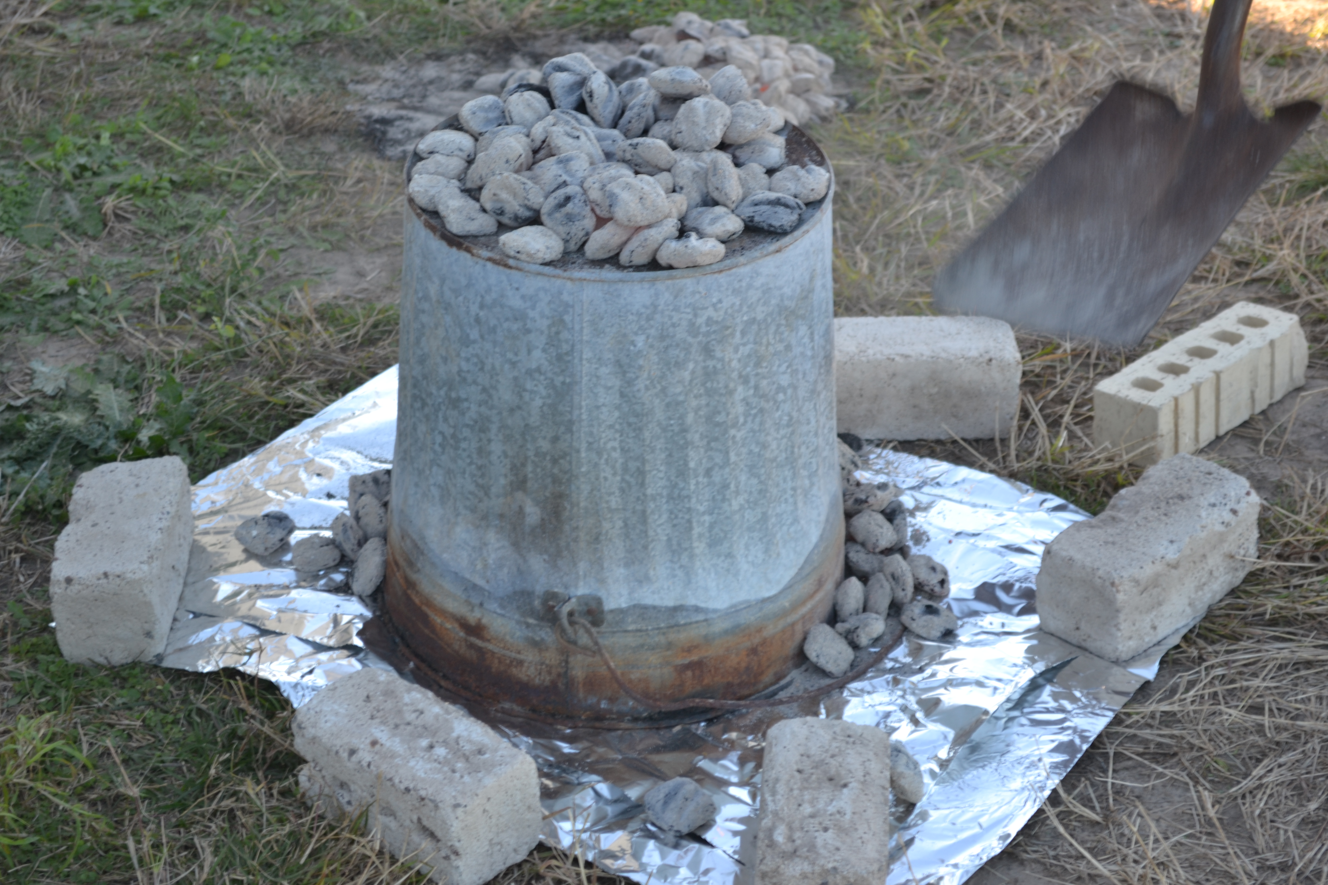Shovel white coals around the outside edge of the trash can and on top.
